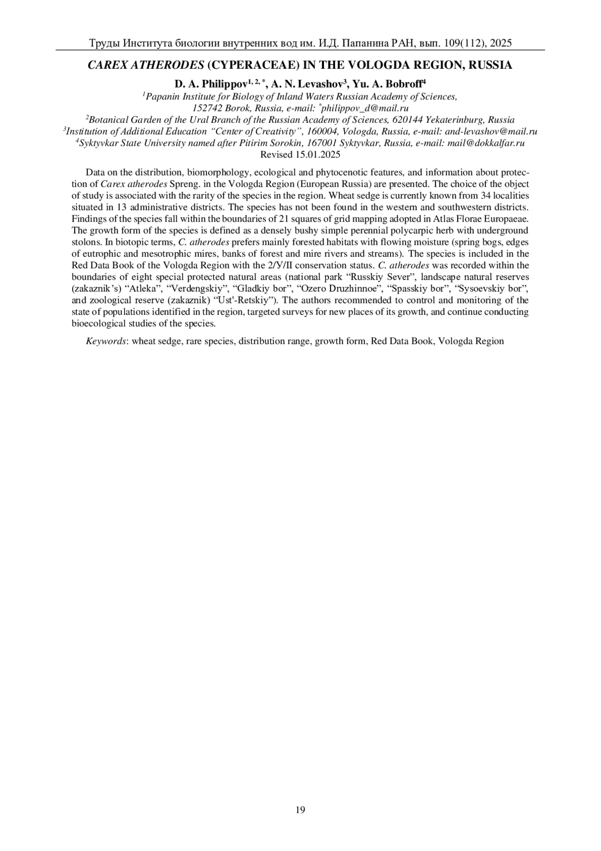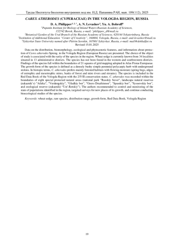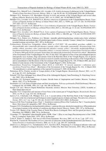 46. Филиппов Д.А., Левашов А.Н., Бобров Ю.А. Carex bohemica (Cyperaceae) в Вологодской области // Труды Ин-та биологии внутренних вод им. И.Д. Папанина РАН. 2023. Вып. 101(104). С. 12-22. DOI: 10.47021/0320-3557-2023-12-22