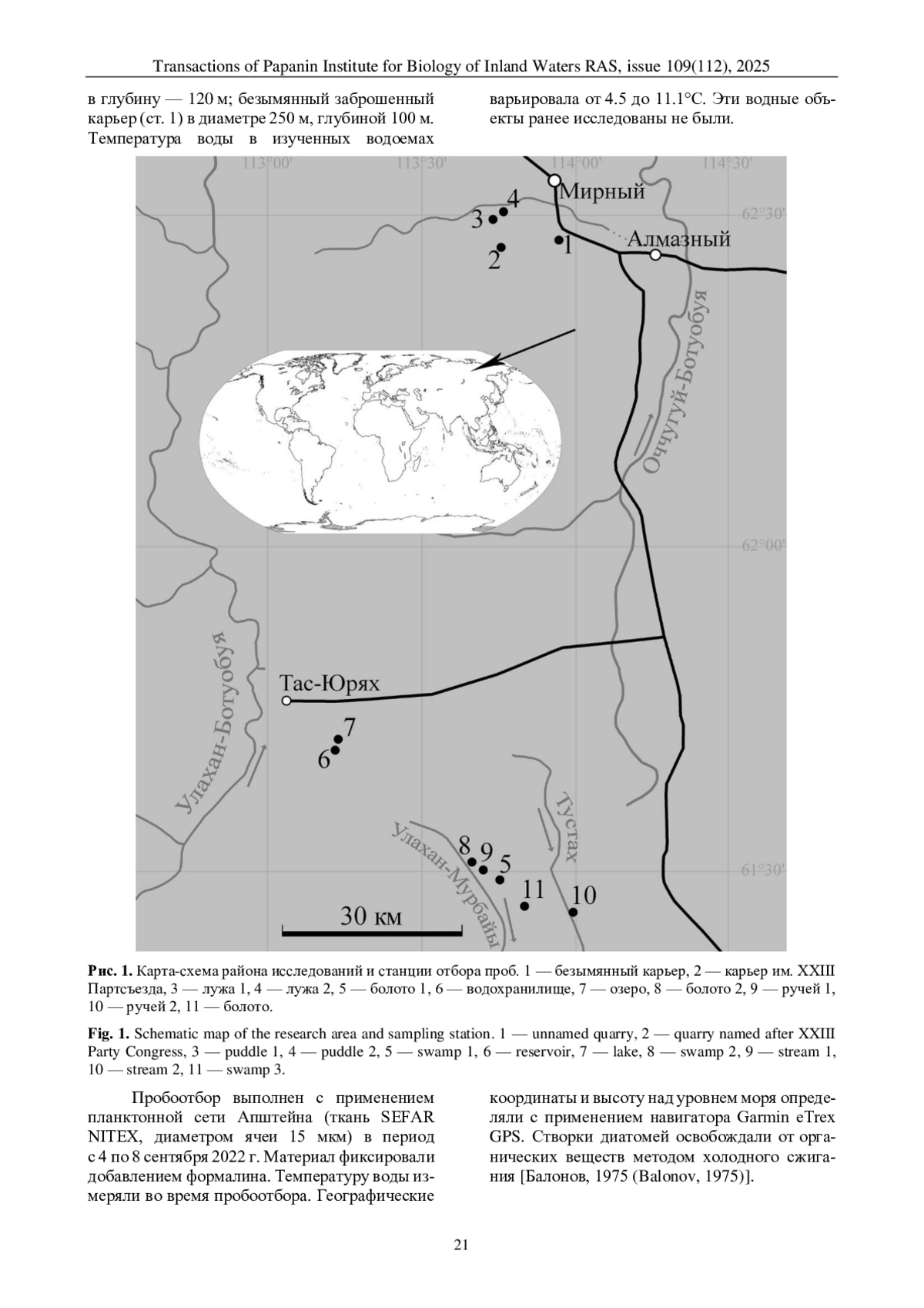 В первой обобщающей монографии по диатомовым водорослям Якутии приведено 628 видов, разновидностей и форм [Комаренко, Васильева, 1975 (Komarenko, Vasileva, 1975)]. В последующей монографии этот список расширен до 875 [Разнообразие…, 2005 (Razno-obrazie…, 2005)]. Приведенные выше работы основаны на данных свето-микроскопических исследованиях. В последние годы появились публикации, основанные на результатах электронно-микроскопических исследований водоемов и водотоков из разных районов республики, которые позволили выявить диатомовые как новые для Якутии (135), так и России (31) [Генкал, Габышев, 2020а, б; 2021; 2023a (Genkal, Gabushev, 2020a, b, 2021, 2023a); Генкал и др., 2020 (Genkal et al., 2020); Копырина и др., 2021 (Kopyrina et al., 2021)]. При этом в исследованных водоемах и водотоках 42 формы определены только до рода [Генкал, Габышев, 2020а, б; 2023а (Genkal, Gabushev, 2020a, b, 2023а); Генкал и др., 2020 (Genkal et al., 2020); Копырина и др., 2021 (Коpyrina et al., 2021)] и описано 5 видов новых для науки [Potapova et al., 2014; Генкал, Габышев, 2023б, 2024 (Genkal, Gabyshev, 2023b, 2024)].