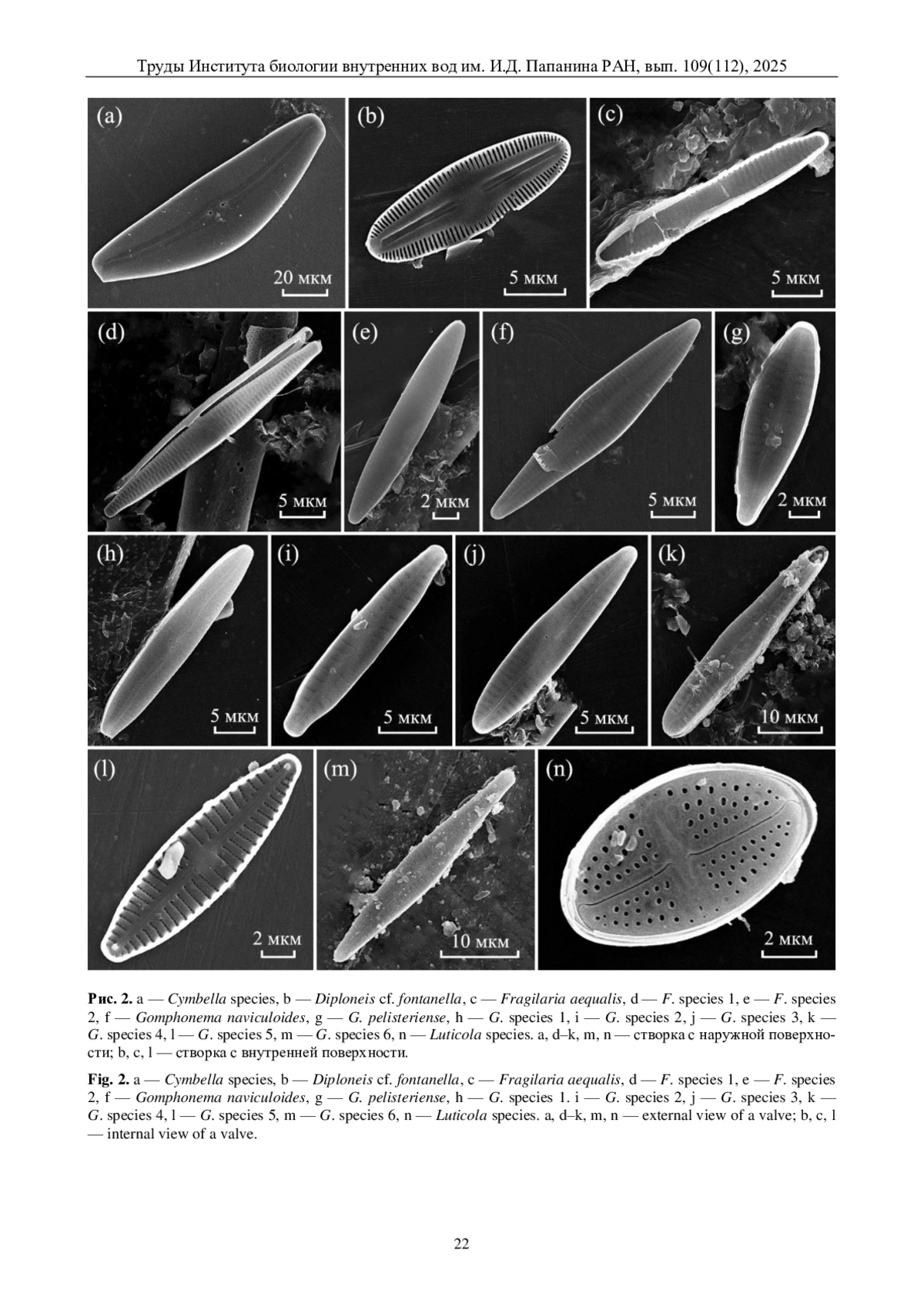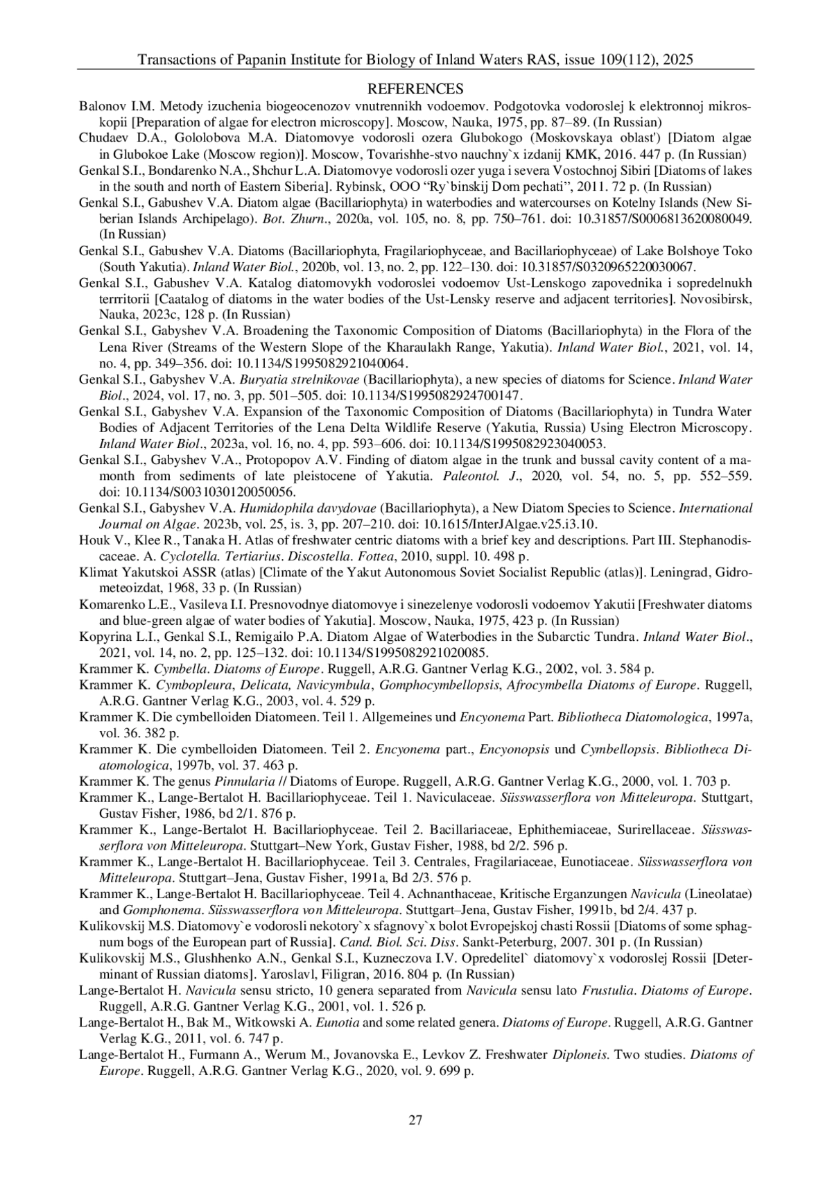 14. 	Genkal S.I., Gabyshev V.A. Expansion of the Taxonomic Composition of Diatoms (Bacillariophyta) in Tundra Water Bodies of Adjacent Territories of the Lena Delta Wildlife Reserve (Yakutia, Russia) Using Electron Microscopy // Inland Water Biology. 2023a. Vol. 16. № 4. P. 593-606. DOI: 10.1134/S1995082923040053