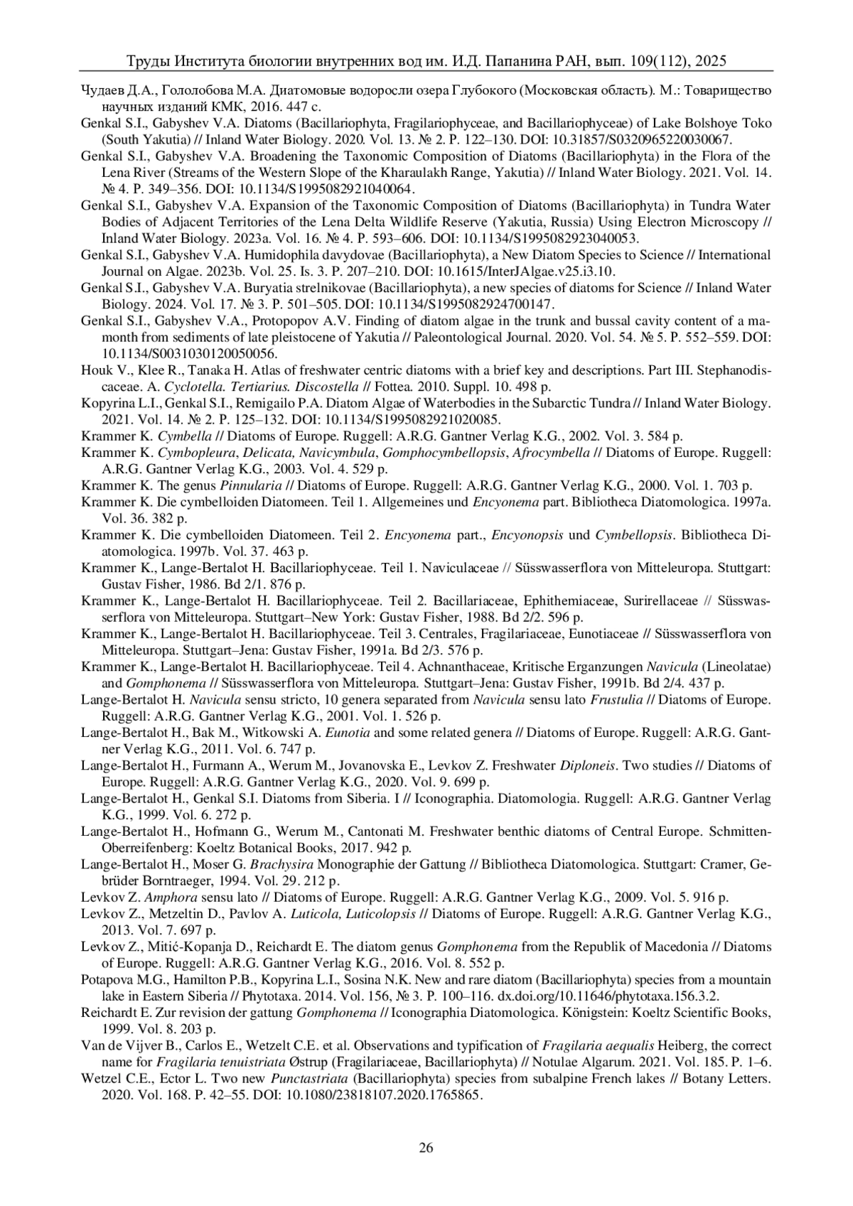 3. 	Генкал C.И., Габышев В.А. Каталог диатомовых водорослей водоемов Усть-Ленского заповедника и сопредельных территорий. Новосибирск: Наука, 2023. 128 c.