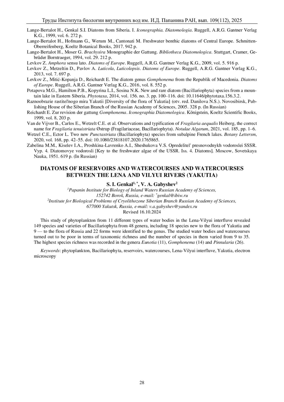 13. 	Genkal S.I., Gabyshev V.A. Broadening the Taxonomic Composition of Diatoms (Bacillariophyta) in the Flora of the Lena River (Streams of the Western Slope of the Kharaulakh Range, Yakutia) // Inland Water Biology. 2021. Vol. 14. № 4. P. 349-356. DOI: 10.1134/S1995082921040064