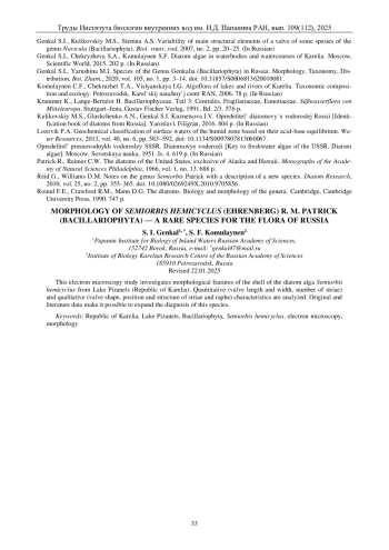 14. 	Genkal S.I., Yarushina M.I. Species of the genus Geissleria (Bacillariophyta) in Russia: morphology, taxonomy and distribution // Inland Water Biology. 2018. Vol. 11, № 4. P. 387-395. DOI: 10.1134/S1995082918040077