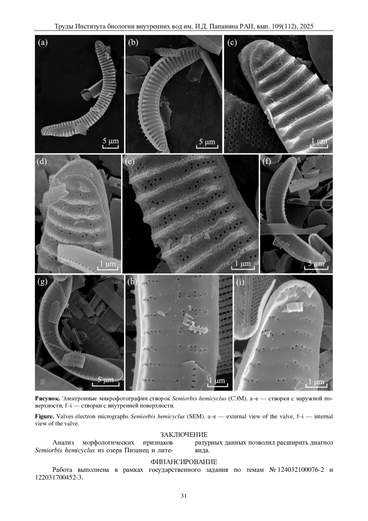 С помощью сканирующей электронной микроскопии проведено изучение морфологических особенностей панциря диатомовой водоросли Semiorbis hemicyclus из оз. Пизанец (республика Карелия). Исследованы количественные (длина и ширина створки, число штрихов) и качественные (форма створки, расположение и строение штрихов и шва) признаки. Оригинальные и литературные данные позволили расширить диагноз этого вида.