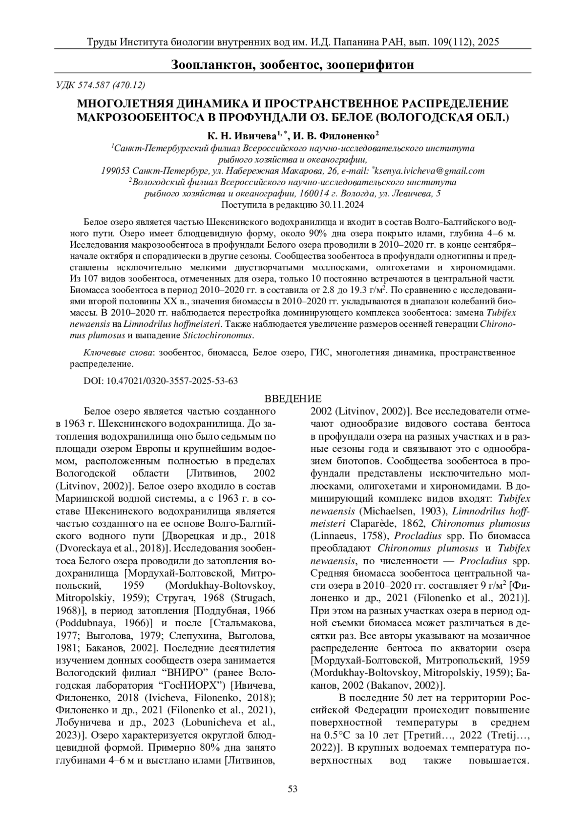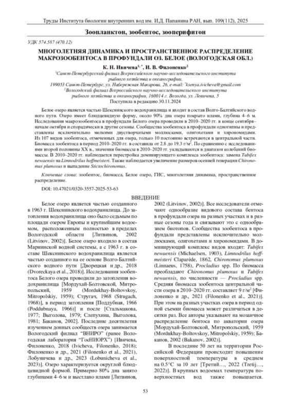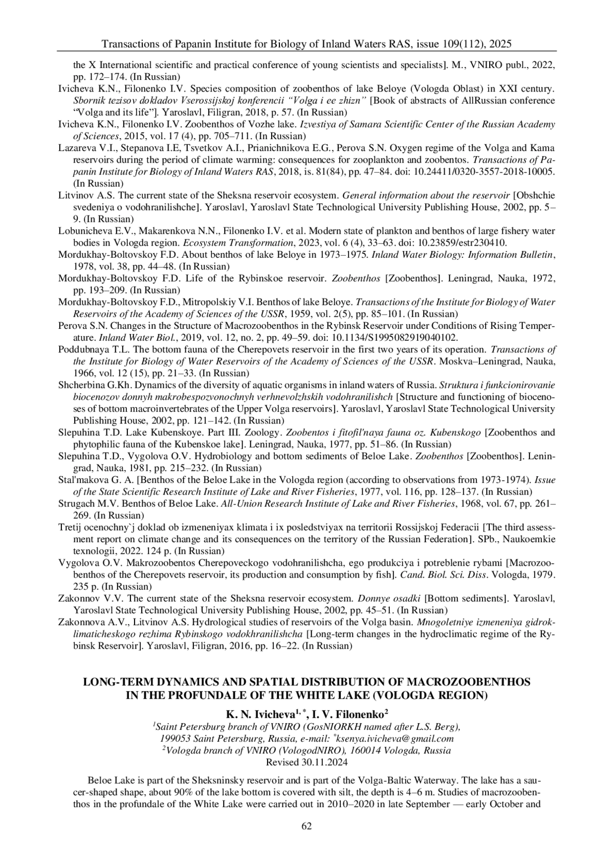 20. 	Филоненко И. В., Комарова А. С., Ивичева К. Н. Анализ факторов, значимых для зообентоса озера Белое Вологодской области // Принципы экологии. 2021. № 3. С. 74. DOI: 10.15393/j1.art.2021.11902