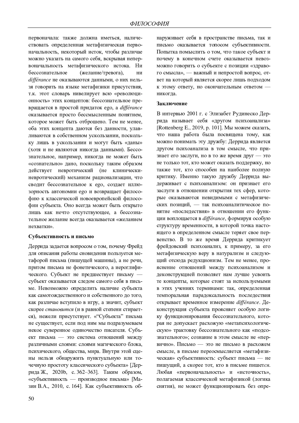 Целью данной работы является артикуляция структурных связей между расщепленным субъектом в рамках фрейдовского и лакановского психоанализа и децентрированным дискурсом в рамках (пост)структуралистского философствования на материале работ Деррида. Как психоанализ, так и проект Деррида оказываются особого рода не-регионалистскими (в смысле региональных онтологий) проектами, пытающимися артикулировать и продемонстрировать то, что упускается в классической метафизике присутствия. Как психоанализ, так и деконструкция направлены на то, чтобы вырвать у присутствия примат его трансцендентности, показать, что «центральный» элемент письма является эффектом самого этого письма, но не точкой референции, к которой это письмо якобы отсылает. Субъективность также оказывается не точкой самоналичия и самотождественности, а эффектом структуры. Субъективность обнаруживает себя в пространстве письма, а само письмо оказывается топосом субъективности. Обнаружить следы психоанализа в работах Деррида можно посредством сопоставления концепта différance Деррида и понятия последействия Фрейда: именно через особую трактовку темпоральности как прошлого, которое никогда не было настоящим, можно осуществить акт деконструкции как акт разрушения всякого акта (поскольку акт оказывается отнесенным к субъекту). Результатом работы является определенная рационализация différance, которое оказывается «сердцем» деконструкции у раннего Деррида, и такая рационализация осуществляется через сопоставление с функционированием последействия в структуре травмы. Субъект тем самым оказывается принципиально разорванным, и этот разрыв является конститутивным для субъективности как таковой, субъект обнаруживает в письме след себя самого, но никогда не может обрести полного, чистого самоналичия. Новизна данной работы заключается в том, что проработке этой структурной взаимосвязи на уровне понятий, как правило, не уделяют должного внимания; в данной работе предлагается такая интерпретация, которая прослеживает взаимосвязь между деконструкцией и психоанализом не в общем, а на уровне связи концептов différance и последействия (а также бессознательного вообще), что позволяет прояснить употребление этих понятий во взаимосвязи, а также проливает свет на смежные понятия субъекта и письма.