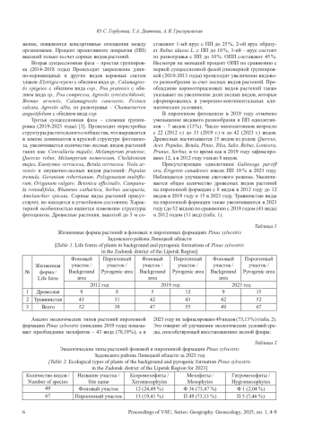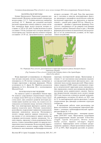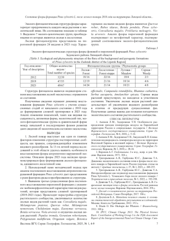 В 2010 году лесные пожары уничтожили 625,6 тыс. га лесной площади и почв, расположенных под лесными насаждениями на территории Российской Федерации. По данным метеорологов лето 2010 года отмечено температурными максимумами выше 40 °С. Длительное время осадков не было, понизился уровень грунтовых вод, травяной покров засох. Сложившиеся климатические условия отрицательно сказались на видовом разнообразии флоры леса, способствовали возникновению лесного пожара. Из лесообразующих пород пострадала ценная хвойная порода - Pinus sylvestris. Цель - дать анализ динамики флоры фоновой и пирогенной формаций Pinus sylvestris на территории Липецкой области за период с 2011 по 2023 годы. Материалы и методы. С 2011 по 2023 год заложено и описано по 40 учётных площадок ежегодно. Учет обилия проведен по О. Друде. Результаты и обсуждение. Получены новые сведения о состоянии флоры формации Pinus sylvestris с координатами пирогенного (с. ш. 52°30’37.3“; в. д. 38°57’28.7“)и фонового (с. ш. 52°30’39.2“; в. д. 38°57’30.3“) участков. Представлены результатам изучения флоры за 13-летний период после лесного пожара 2010 года на территории Липецкой области, расположенной в средней части Европейской России. Выводы. Выявлены фазы флористических сукцессий в растительных группировках при формировании пирогенной формации: 1 - пионерная группировка (2010-2013); 2 - простая группировка (2014-2018); 3 - сложная группировка (2019-2023).
