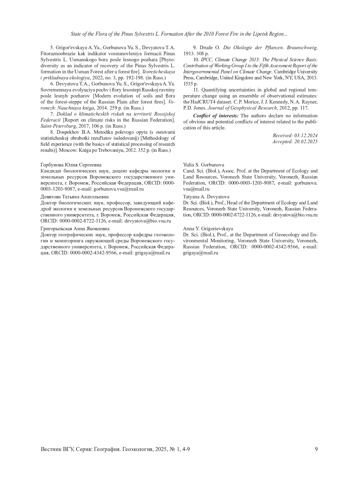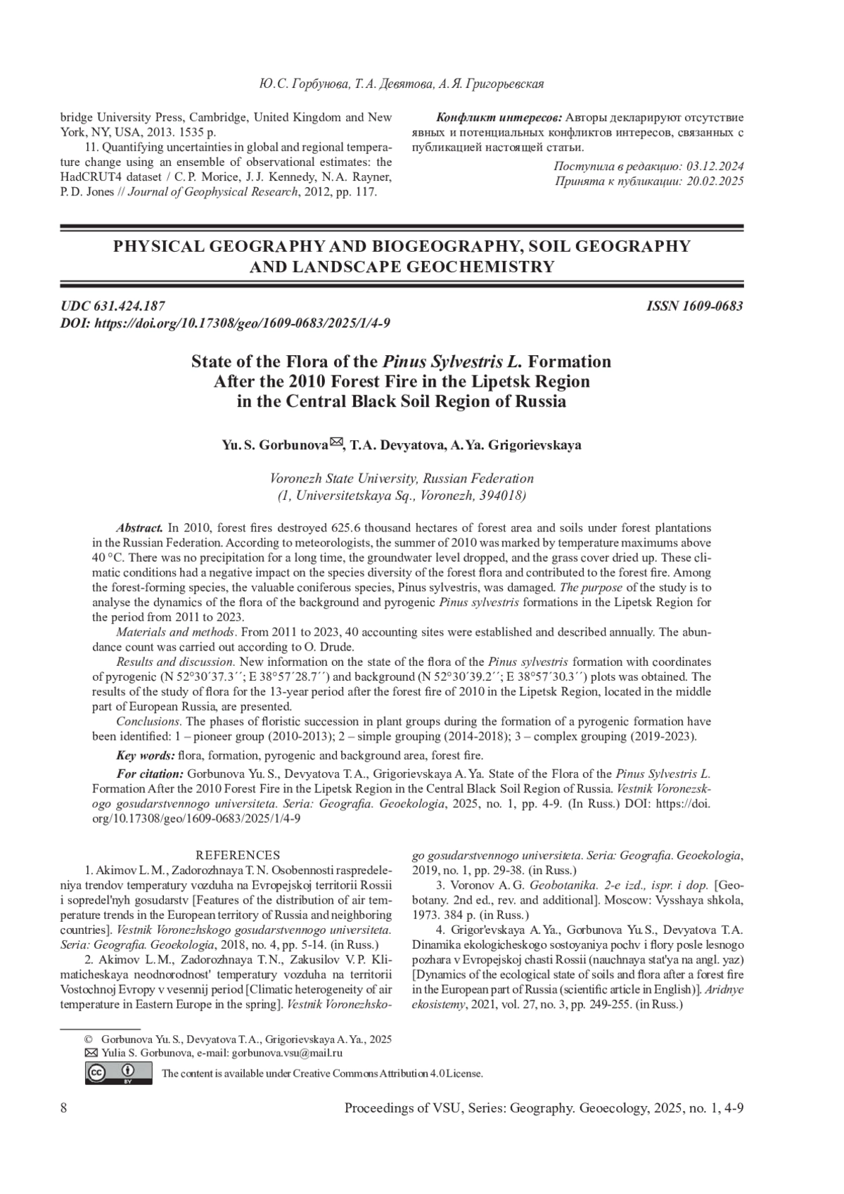 6. 	Девятова Т. А., Горбунова Ю. С., Григорьевская А.Я. Современная эволюция почв и флоры лесостепи Русской равнины после лесных пожаров. Воронеж: Научная книга, 2014. 259 с. EDN: VEYOKB