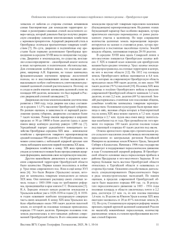 Цель - проанализировать закономерности земледельческого освоения Оренбургской области. Материалы и методы. Использованы материалы собственных многолетних полевых исследований агроландшафтов, литературные и фондовые материалы по истории земледельческого освоения края. Применены сравнительно-исторический и сравнительно-типологический анализ, логические обобщения. Результаты и обсуждение. В Оренбургской области выделены: лесостепные северо-западные районы дворянского освоения, северостепные и степные районы переселенческого освоения, степные и южностепные районы казачьего освоения, южные и юго-восточные степные районы позднего переселенческого освоения и доосвоения в ходе советской целинной кампании, восточные классические целинные сухостепные районы. Сравниваются локальные варианты ведения сельского хозяйства. Выводы. Область осваивалась земледелием с северо-запада на юг и юго-восток, в направлениях понижения как благоприятности природных условий, так и безопасности для земледельцев. Освоение мотивировалось и поддерживалось государством на протяжении всей его истории. Половина целинной кампании 1950-х годов охватила территории, уже освоенные земледелием. Общим итогом освоения является распашка практически всех технологически доступных степных земель на площади свыше 7 млн. га, из которых не менее 2 млн. га потенциально малопродуктивны.