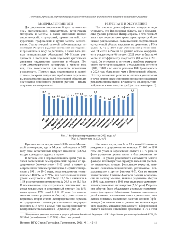 Цель - рассмотреть тенденции, проблемы, перспективы рождаемости Воронежской области и возможности устойчивого развития региона. В последние годы падение рождаемости обусловливает ухудшение демографических процессов, что в будущем приведет к значительному сокращению трудовых ресурсов. Материалы и методы. Использовались статистический, литературный, исторический, системный, аналитический, структурный, сравнительный, конкурентный, графический и другие методы исследования. Статистической основой работы являлась информация Росстата («Демографический ежегодник») и приложение к нему по регионам, а также база данных муниципальных образований Российской Федерации. Результаты и обсуждение. Рассмотрены тенденции и трансформации рождаемости населения за многие годы. Воспроизводственный потенциал населения еще пока позволяет избежать демографической катастрофы в регионе. Выводы. Необходимо изменение демографической политики для развития многодетности. Нужна дифференцированная по регионам страны демографическая политика. В наибольшей степени необходимо стимулировать Центр России, который имеет самую регрессионную структуру населения.