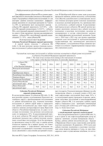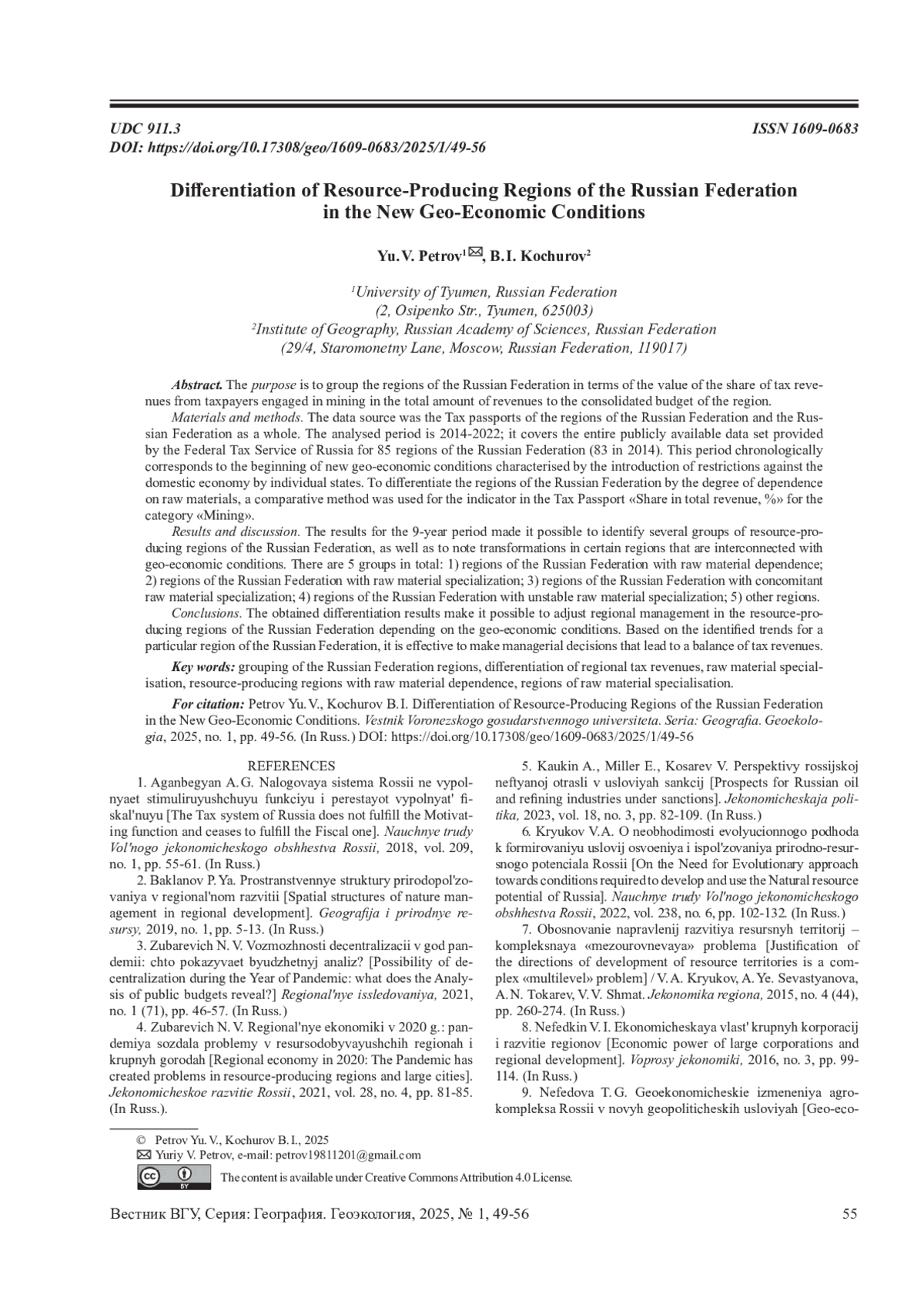 Цель - выполнить группировку субъектов Российской Федерации (РФ) с позиций значения удельного веса налоговых поступлений от налогоплательщиков, осуществляющих добычу полезных ископаемых, в общей сумме поступлений в консолидированный бюджет региона. Материалы и методы. Источником данных послужили Налоговые паспорта субъектов РФ и РФ в целом. Анализируемый период - 2014-2022; охватывает весь предоставляемый Федеральной налоговой службой России общедоступный массив данных по 85 субъектам РФ (83 в 2014 году). Данный период в хронологическом отношении соответствует началу новых геоэкономически условий, характеризующихся вводом против отечественной экономики рестрикций со стороны отдельных государств. Для дифференциации субъектов РФ по степени сырьевой зависимости применён сопоставительный метод для показателя в Налоговом паспорте «Удельный вес в общей сумме поступлений, %» для категории «Добыча полезных ископаемых». Результаты и обсуждение. Итоги за 9-летний период позволили выделить несколько групп ресурсодобывающих субъектов РФ, а также отметить взаимоувязанные с геоэкономическими условиями трансформации в отдельных регионах. Всего выделено 5 групп: 1) субъекты Российской Федерации сырьевой зависимости; 2) субъекты Российской Федерации сырьевой специализации; 3) субъекты Российской Федерации с сопутствующей сырьевой специализацией; 4) субъекты Российской Федерации с неустойчивой сырьевой специализацией; 5) иные регионы. Выводы. Полученные результаты дифференциации позволяют настраивать региональное управление в ресурсодобывающих субъектах РФ в зависимости от геоэкономических условий. На основе выявленных трендов для конкретного субъекта РФ эффективно принятие управленческих решений, приводящих к балансу налоговых поступлений.