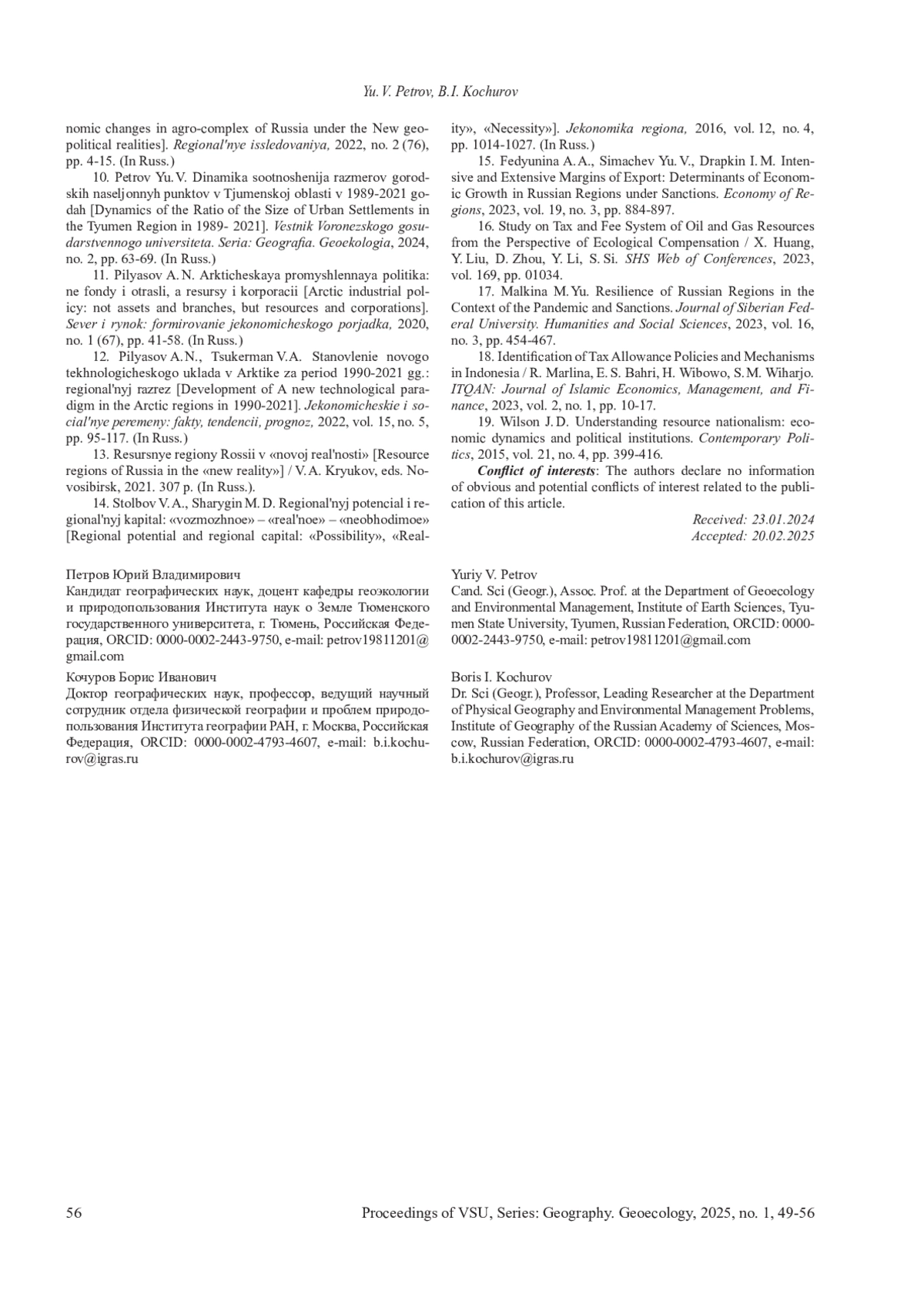 10. 	Петров Ю.В. Динамика соотношения размеров городских населённых пунктов в Тюменской области в 1989-2021 годах // Вестник Воронежского государственного университета. Серия: География. Геоэкология, 2024, № 2, с. 47-53. EDN: LPZHRN