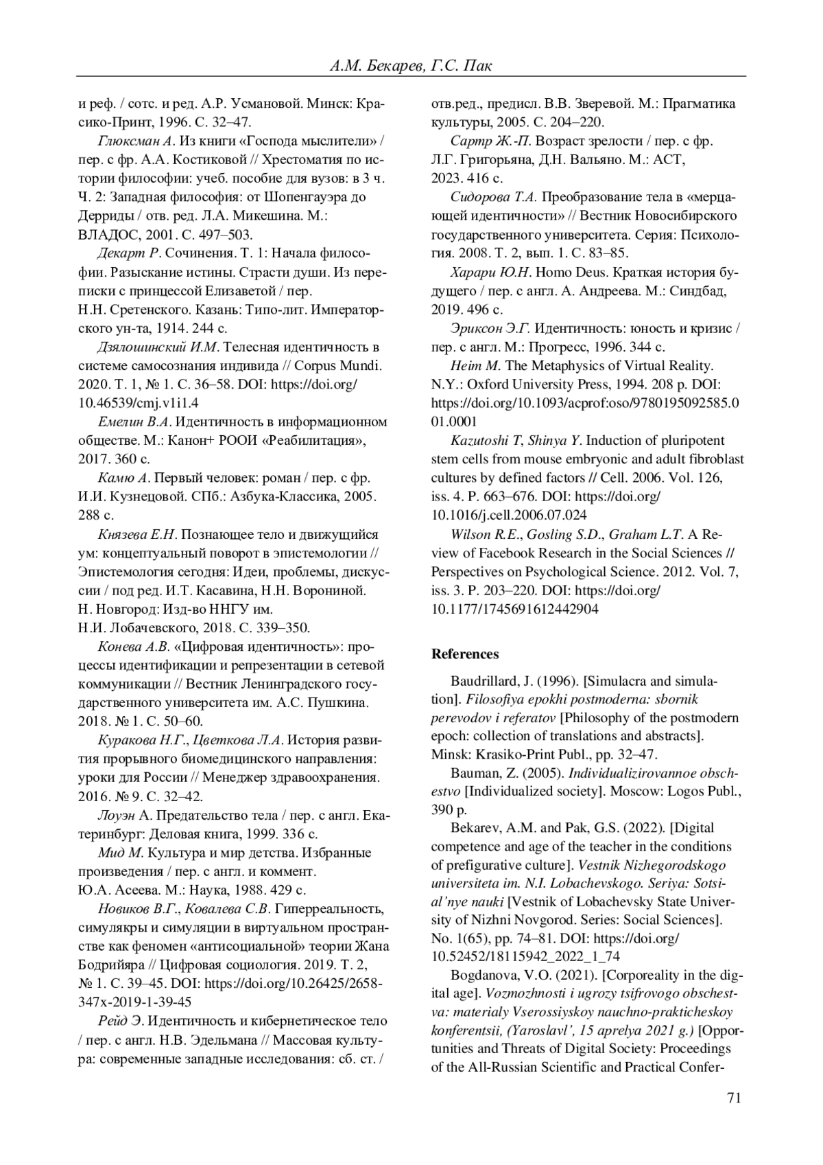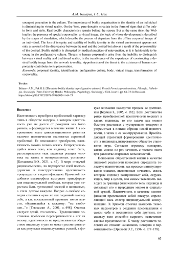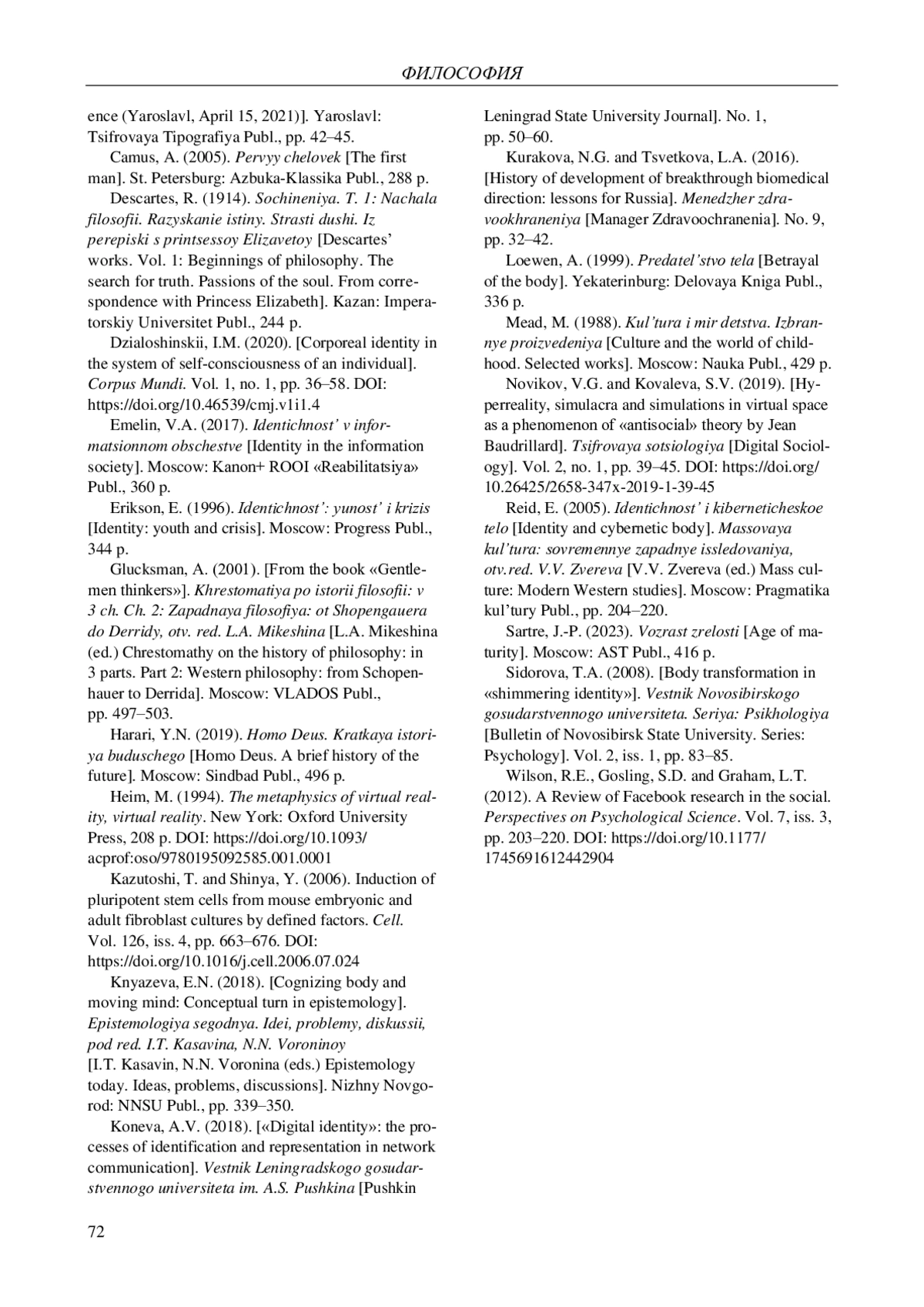 7. Дзялошинский И.М. Телесная идентичность в системе самосознания индивида // Corpus Mundi. 2020. Т. 1, № 1. С. 36-58. DOI: 10.46539/cmj.v1i1.4 EDN: BCQXCG