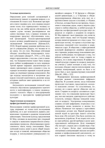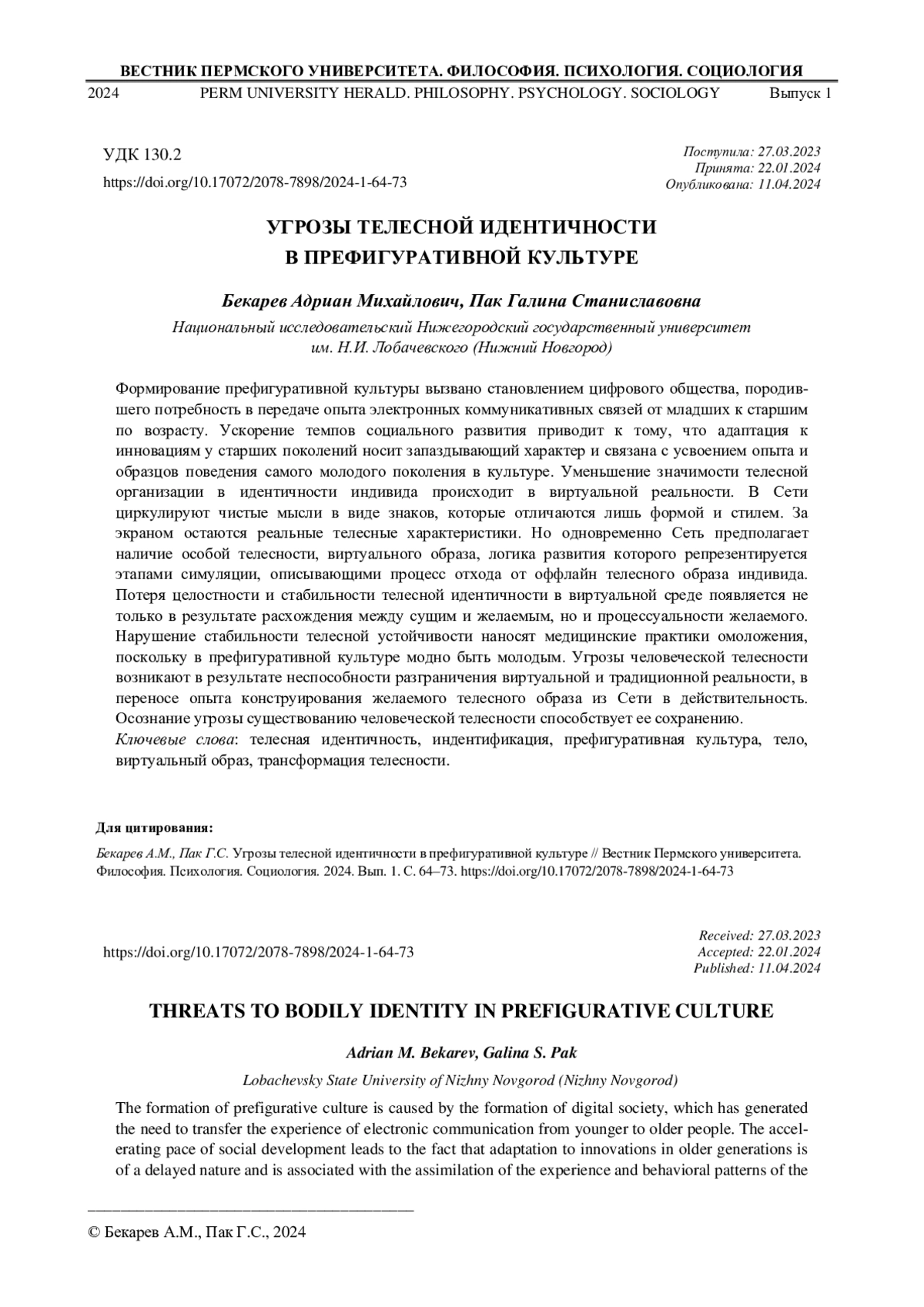 Формирование префигуративной культуры вызвано становлением цифрового общества, породившего потребность в передаче опыта электронных коммуникативных связей от младших к старшим по возрасту. Ускорение темпов социального развития приводит к тому, что адаптация к инновациям у старших поколений носит запаздывающий характер и связана с усвоением опыта и образцов поведения самого молодого поколения в культуре. Уменьшение значимости телесной организации в идентичности индивида происходит в виртуальной реальности. В Сети циркулируют чистые мысли в виде знаков, которые отличаются лишь формой и стилем. За экраном остаются реальные телесные характеристики. Но одновременно Сеть предполагает наличие особой телесности, виртуального образа, логика развития которого репрезентируется этапами симуляции, описывающими процесс отхода от оффлайн телесного образа индивида. Потеря целостности и стабильности телесной идентичности в виртуальной среде появляется не только в результате расхождения между сущим и желаемым, но и процессуальности желаемого. Нарушение стабильности телесной устойчивости наносят медицинские практики омоложения, поскольку в префигуративной культуре модно быть молодым. Угрозы человеческой телесности возникают в результате неспособности разграничения виртуальной и традиционной реальности, в переносе опыта конструирования желаемого телесного образа из Сети в действительность. Осознание угрозы существованию человеческой телесности способствует ее сохранению.
