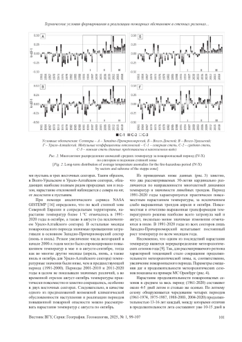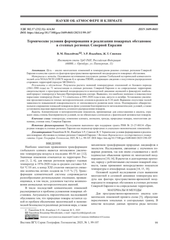 Цель - анализ многолетних изменений в температурном режиме степных регионов Северной Евразии в качестве одного из факторов пространственно-временной неоднородности пожарных обстановок. Материалы и методы. Основными источниками послужили данные Глобальной исторической климатологической сети NOAA/NCEI (GHCN версия 4) и архивы FIRMS, содержащие сведения о посуточном распределении сгоревших территорий (продукт MCD64A1). Результаты и обсуждение. Результаты расчета значений температурных отклонений от базового периода (1961-1990 годы) по 71 метеостанции в степных регионах Северной Евразии и на сопредельных территориях свидетельствуют о пространственной неоднородности в многолетней динамике аномалий и фиксируют наибольший прирост температур в Западно-Причерноморском секторе. Выявлено, что наиболее значимое и повсеместное нарастание температур (более 1 °С) отмечалось в 1991-2020 годы в мае, августе и октябре. Установлено увеличение продолжительности теплых метеорологических сезонов в среднем на 8-10 дней. Выявлено отсутствие тесной зависимости повышенной пожароопасности от интенсивности развития волн тепла. Подтверждено общерегиональное сокращение площадей пожаров на фоне усиления благоприятности метеоклиматических условий, а также установлена высокая вариативность сезонного распределения пожаров. Выводы. Климатические и метеорологические показатели, принимаемые для сопоставления и анализа, отражают лишь степень благоприятности условий, но не обязательно соотносятся с фактической активностью пожаров.