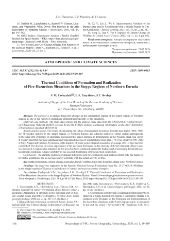 3. 	Особенности формирования и реализации пожароопасных обстановок в Урало-Каспийском регионе в аномально жаркие и засушливые годы / Павлейчик В. М., Языкбаев Э. Р., Сивохип Ж. Т. и др. // Известия Иркутского государственного университета. Серия “Науки о Земле”, 2023, т. 43, с. 62-78. EDN: PZPKZA