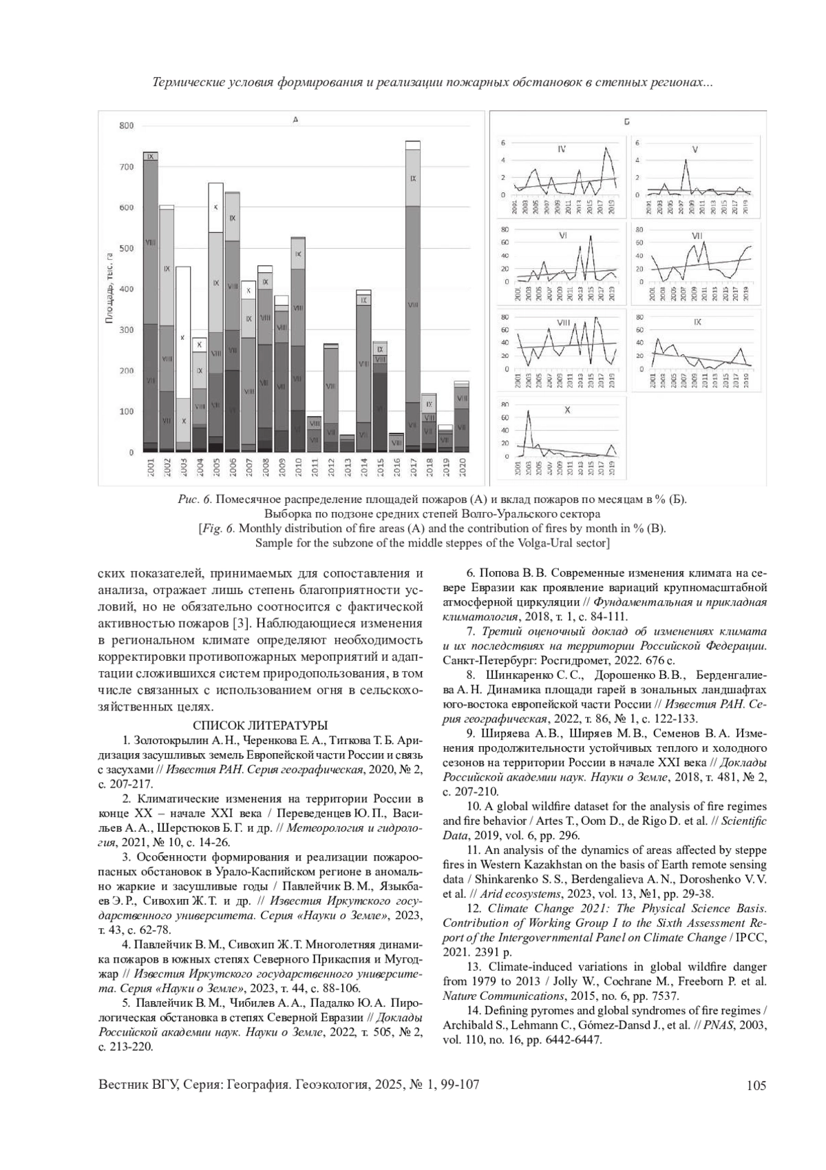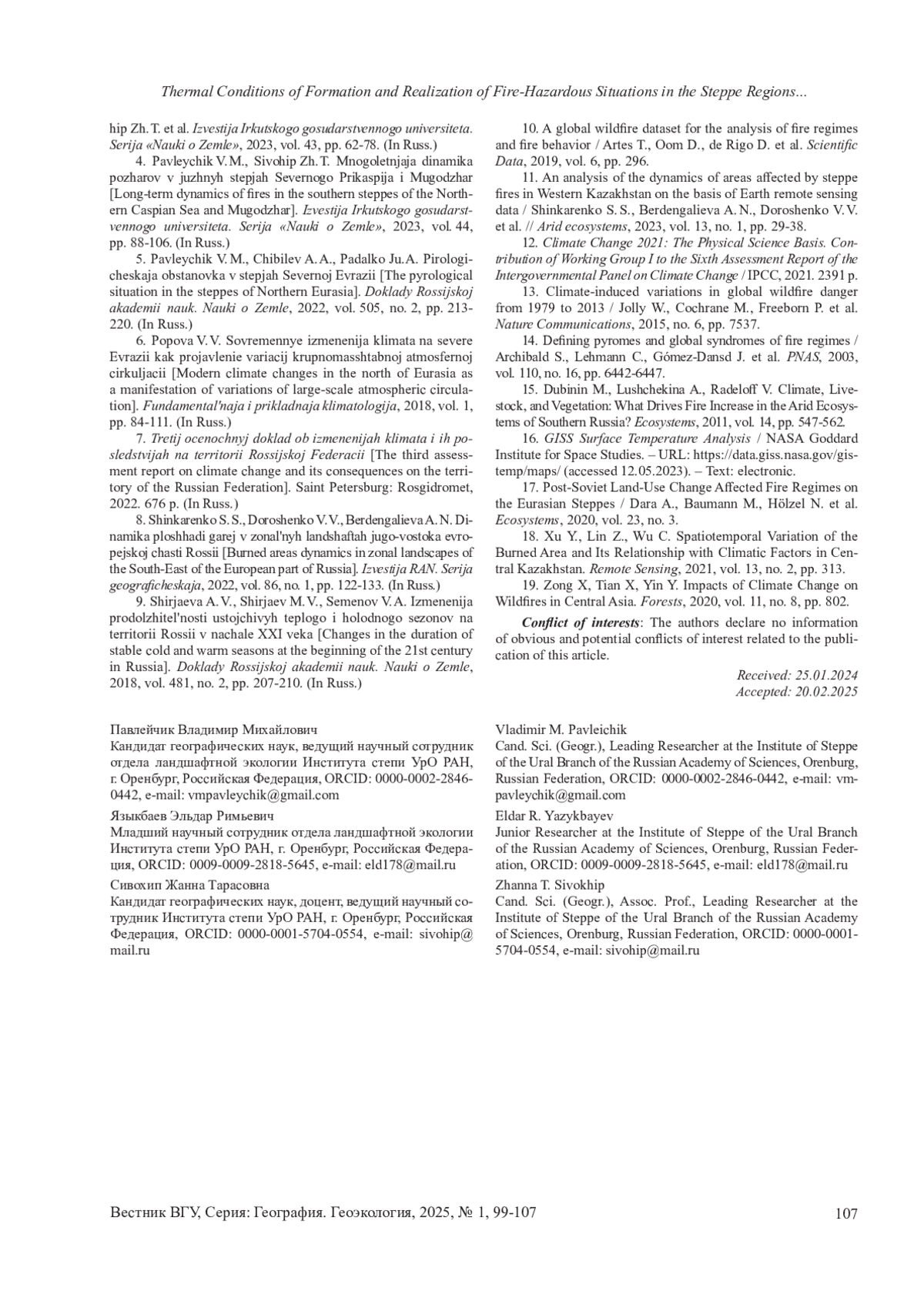4. 	Павлейчик В. М., Сивохип Ж.Т. Многолетняя динамика пожаров в южных степях Северного Прикаспия и Мугоджар // Известия Иркутского государственного университета. Серия “Науки о Земле”, 2023, т. 44, с. 88-106. EDN: CULSBX