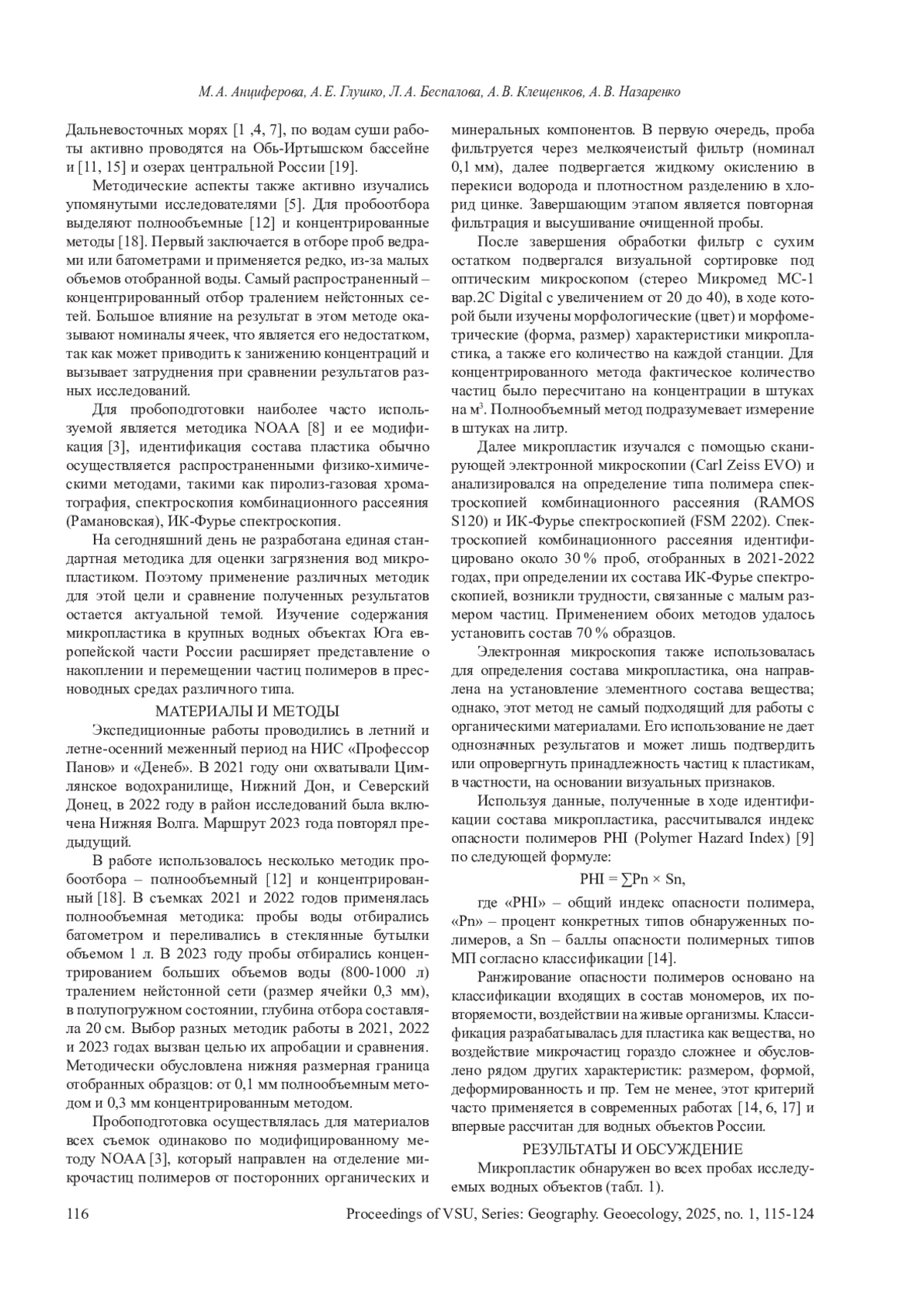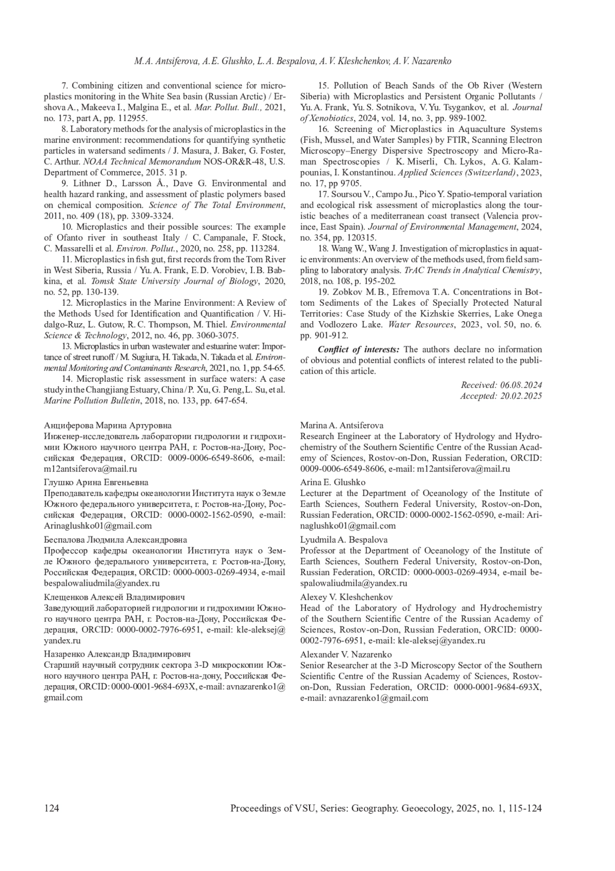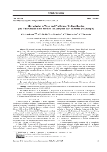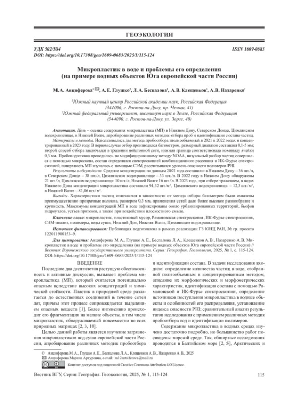 КЛЕЩЕНКОВ А. В., НАЗАРЕНКО А. В., БЕСПАЛОВА Л. А., АНЦИФЕРОВА Г. А., ГЛУШКО А. Е. МИКРОПЛАСТИК В ВОДЕ И ПРОБЛЕМЫ ЕГО ОПРЕДЕЛЕНИЯ (НА ПРИМЕРЕ ВОДНЫХ ОБЪЕКТОВ ЮГА ЕВРОПЕЙСКОЙ ЧАСТИ РОССИИ) // ВЕСТНИК ВОРОНЕЖСКОГО ГОСУДАРСТВЕННОГО УНИВЕРСИТЕТА. СЕРИЯ: ГЕОГРАФИЯ. ГЕОЭКОЛОГИЯ. 2025. № 1