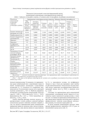 Анализ значений коэффициента вариации (V) – основного относительного показателя степени разнообразия оцениваемых величин концентраций загрязняющих веществ по степени варьирования (0-10 % – малое, 11-30 % – среднее, 31-60 % – высокое, 61-100 % – очень высокое варьирование) – показывает, что содержание в атмосферном воздухе диоксида серы, оксида азота, фенола характеризуется малой степенью варьирования (от 5,6 до 6,9 %), диоксида азота, формальдегида, сажи – средней степенью (от 11,4 до 19,2 %), взвешенных веществ – высокой (42,3 %), оксида углерода – очень высокой степенью варьирования (62,3 %). Значительное варьирование свидетельствует о нарушении закона нормального распределения [8].