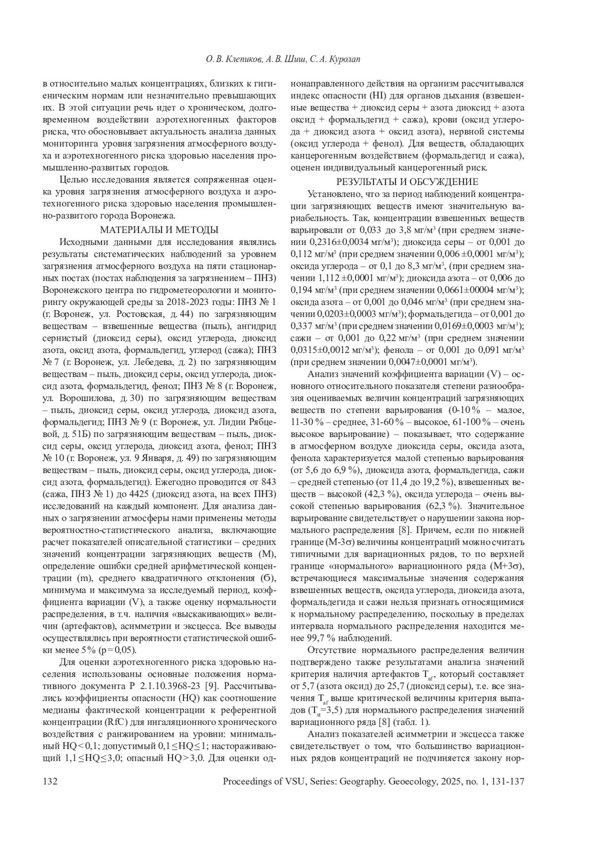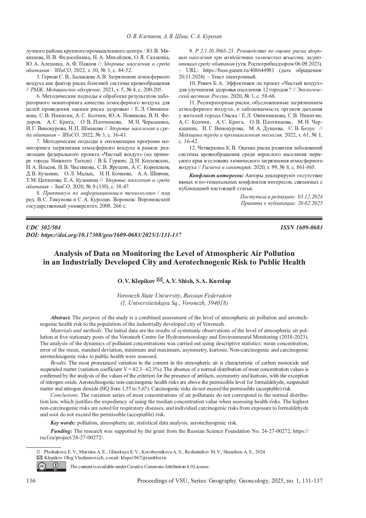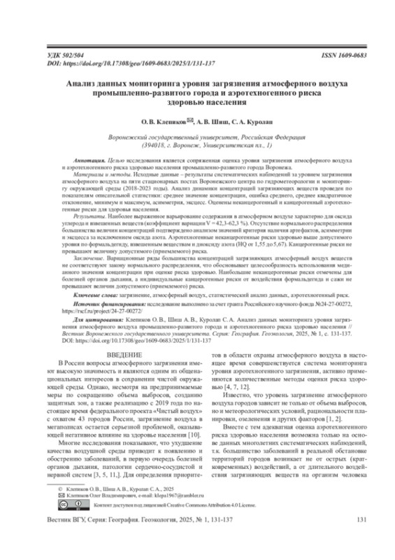 3. 	Андреева Е. С., Климов П.В., Штенске К. С. Загрязнение атмосферного воздуха как один из факторов неканцерогенного риска здоровью населения Ростова-на-Дону // География и природные ресурсы, 2021, т. 42, № 1, с. 42-48. EDN: GYIXMS