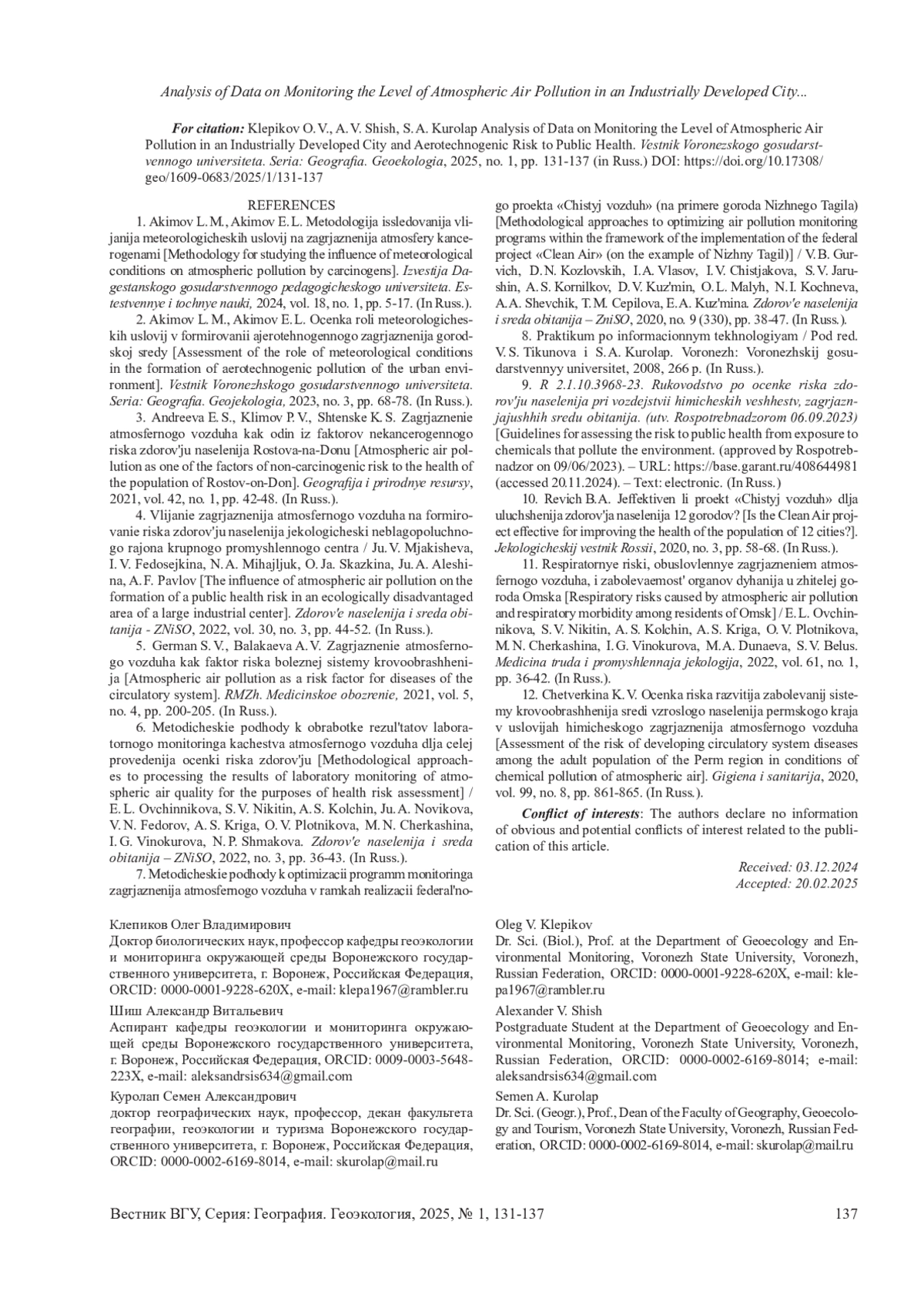 2. 	Акимов Л.М., Акимов Е. Л. Оценка роли метеорологических условий в формировании аэротехногенного загрязнения городской среды // Вестник Воронежского государственного университета. Серия: География. Геоэкология, 2023, № 3, с. 68-78. EDN: PENGHU