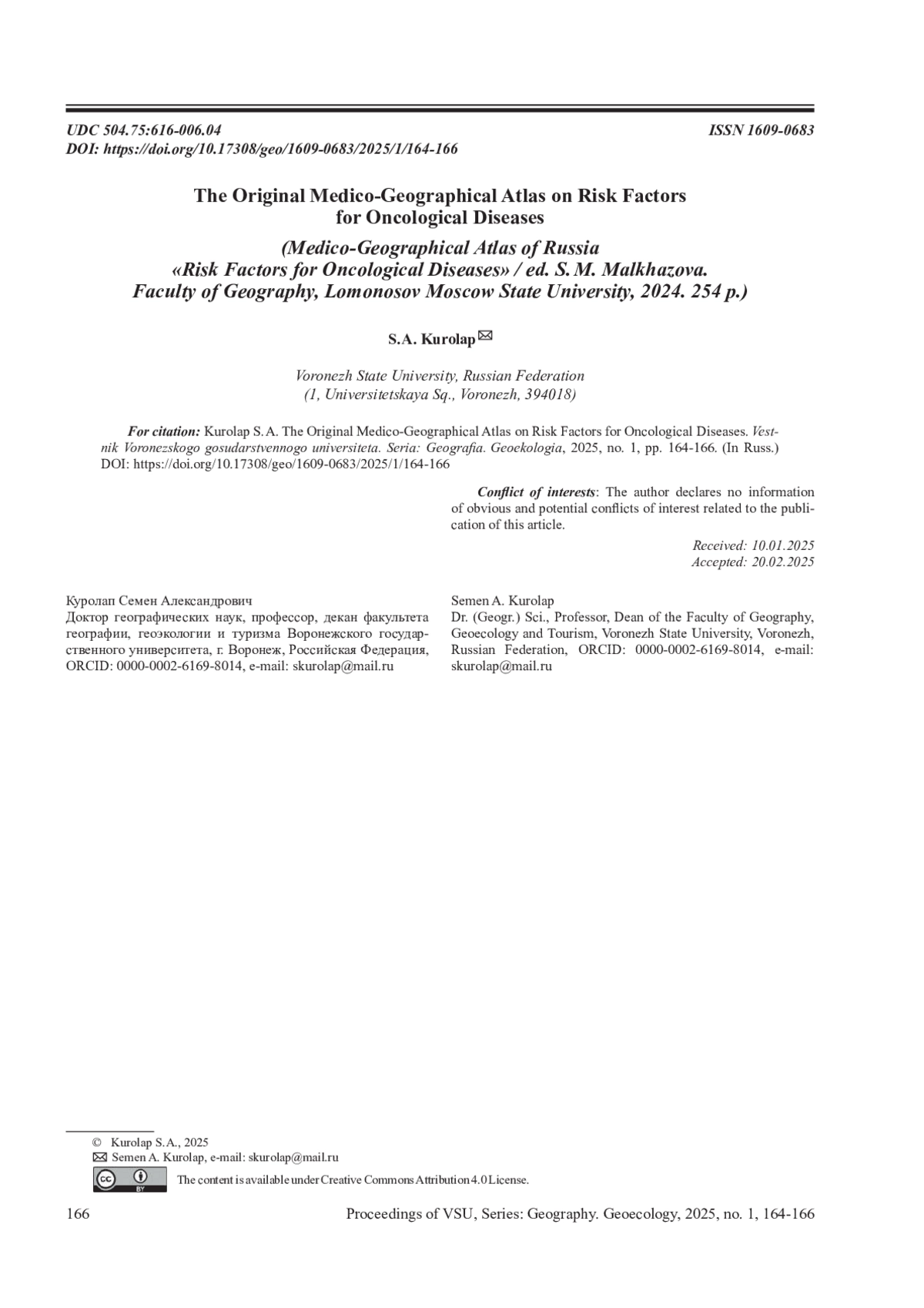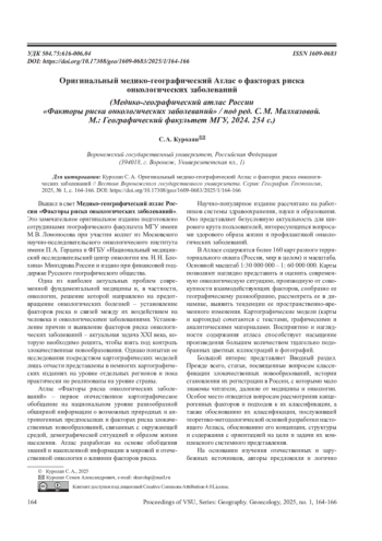 КУРОЛАП С. А. ОРИГИНАЛЬНЫЙ МЕДИКО-ГЕОГРАФИЧЕСКИЙ АТЛАС О ФАКТОРАХ РИСКА ОНКОЛОГИЧЕСКИХ ЗАБОЛЕВАНИЙ (МЕДИКО-ГЕОГРАФИЧЕСКИЙ АТЛАС РОССИИ «ФАКТОРЫ РИСКА ОНКОЛОГИЧЕСКИХ ЗАБОЛЕВАНИЙ» / ПОД РЕД. С. М. МАЛХАЗОВОЙ. М.: ГЕОГРАФИЧЕСКИЙ ФАКУЛЬТЕТ МГУ, 2024. 254 С.) // ВЕСТНИК ВОРОНЕЖСКОГО ГОСУДАРСТВЕННОГО УНИВЕРСИТЕТА. СЕРИЯ: ГЕОГРАФИЯ. ГЕОЭКОЛОГИЯ. 2025. № 1