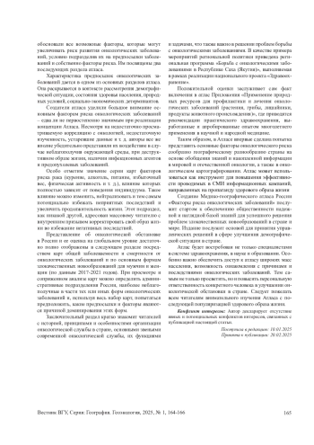 Статья: ОРИГИНАЛЬНЫЙ МЕДИКО-ГЕОГРАФИЧЕСКИЙ АТЛАС О ФАКТОРАХ РИСКА ОНКОЛОГИЧЕСКИХ ЗАБОЛЕВАНИЙ (МЕДИКО-ГЕОГРАФИЧЕСКИЙ АТЛАС РОССИИ «ФАКТОРЫ РИСКА ОНКОЛОГИЧЕСКИХ ЗАБОЛЕВАНИЙ» / ПОД РЕД. С. М. МАЛХАЗОВОЙ. М.: ГЕОГРАФИЧЕСКИЙ ФАКУЛЬТЕТ МГУ, 2024. 254 С.) (2025)