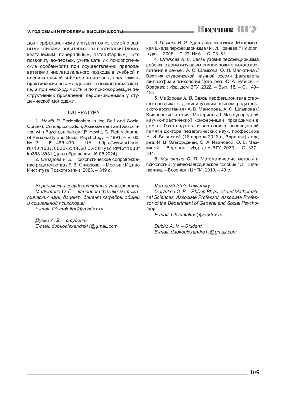5. Майорова А. В. Связь перфекционизма старшеклассника с доминирующим стилем родительского воспитания / А. В. Майорова, А. С. Шлыкова // Вьюновские чтения. Материалы I Международной научно-практической конференции, проводимой в рамках Года педагога и наставника, посвященной памяти доктора педагогических наук, профессора Н. И. Вьюновой (18 апреля 2023 г., Воронеж) / под ред. И. В. Завгородней, О. А. Ивановой, О. Б. Мазкиной. - Воронеж: Изд. дом ВГУ, 2023. - С. 337341. EDN: MLQJRW