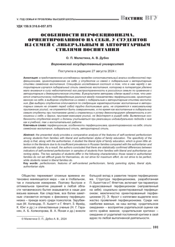 В представленном исследовании проведен сопоставительный анализ особенностей перфекционизма, ориентированного на себя, у студентов из семей с либеральным и авторитарным стилями семейного воспитания. Специфика исследования состоит в том, что в нем наряду с авторитарным изучался либеральный стиль семейного воспитания, которому в литературе уделено мало внимания в силу недостаточной его распространенности в российских семьях по сравнению с авторитарным и демократическим стилями. В результате авторами сделан вывод о том, что имеются статистически подтвержденные различия между показателями перфекционизма, ориентированного на себя, в выборках студентов из семей с либеральным и авторитарным стилями воспитания. Две выборки студентов отличаются по следующим характеристикам: воспитанные в авторитарных семьях не ставят перед собой трудно достижимые цели, не стремятся к максимальному приложению усилий, не стремятся быть совершенными, в то время как воспитанные в либеральных семьях студенты при постановке целей и стремлении к успеху демонстрируют адекватность в отношении и себя, и других, прилагая максимум усилий, не действуют в ущерб себе. Выявленные особенности студентов могут и должны учитываться при реализации индивидуального подхода к ним как в учебной, так и воспитательной работе.