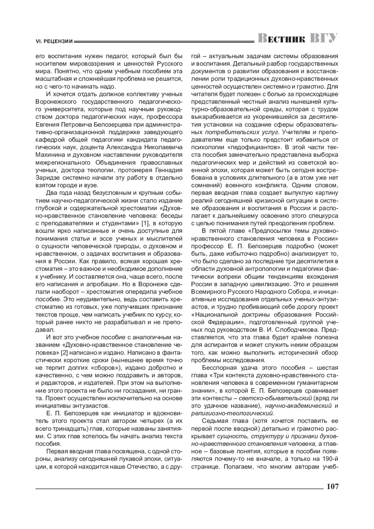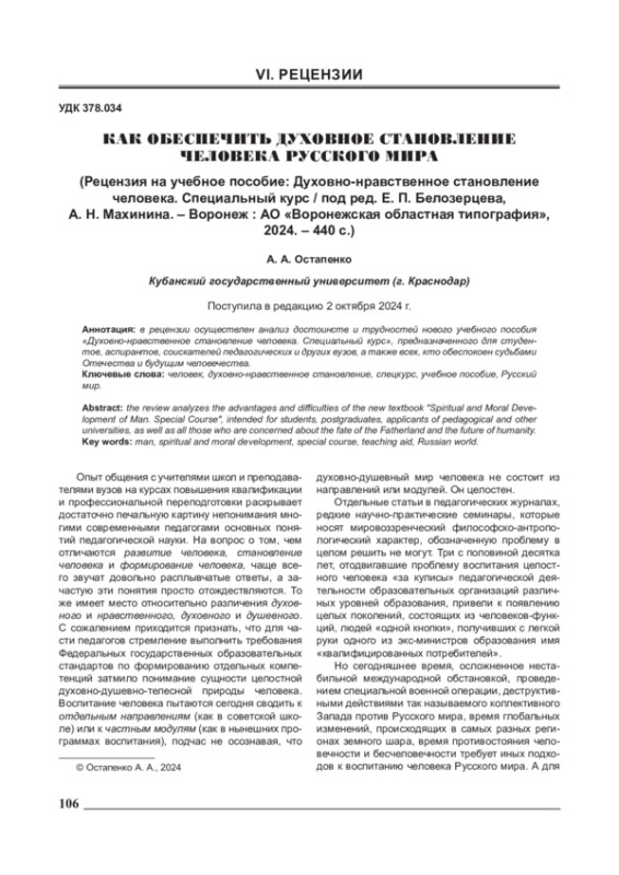 В рецензии осуществлен анализ достоинств и трудностей нового учебного пособия «Духовно-нравственное становление человека. Специальный курс», предназначенного для студентов, аспирантов, соискателей педагогических и других вузов, а также всех, кто обеспокоен судьбами Отечества и будущим человечества.