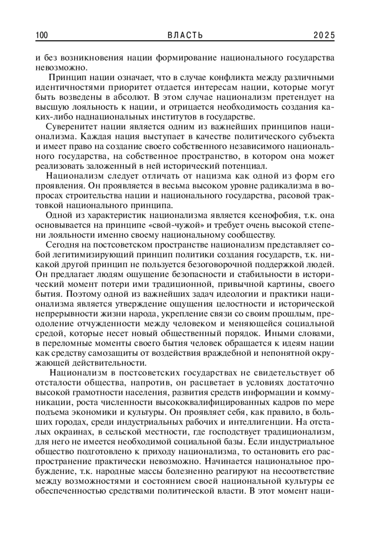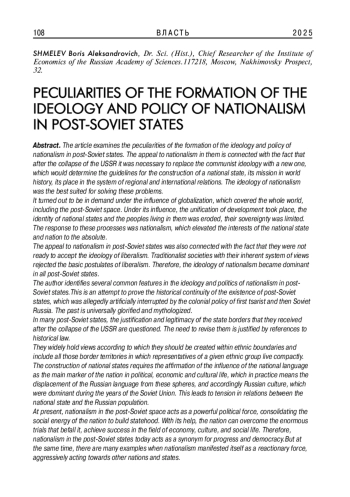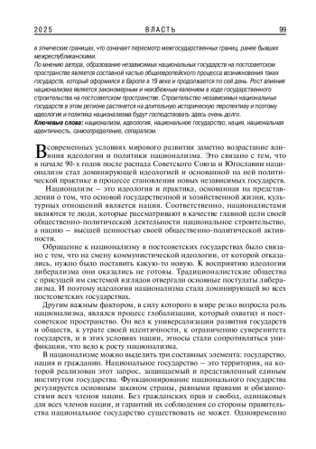 В статье рассматриваются особенности становления идеологии и политики национализма в постсоветских государствах. Обращение к национализму в них было связано с тем, что на смену коммунистической идеологии после распада СССР нужно было поставить новую, которая бы определяла ориентиры строительства национального государства, его миссию в мировой истории, место в системе региональных и международных отношений. Она как нельзя лучше подходила для решения этих задач. Идеология национализма оказалась востребованной и под влиянием глобализации, охватившей весь мир, и в том числе постсоветское пространство. Под его воздействием проходила унификация развития, размывалась идентичность национальных государств и проживавших в≈них народов, ограничивался их суверенитет. Ответом на эти процессы явился национализм, который возводил в абсолют интересы национального государства и нации. Обращение к национализму в постсоветских государствах было связано также и с тем, что к восприятию идеологии либерализма они оказались не готовы. Традиционалисткие общества с присущей им системой взглядов отвергали основные постулаты либерализма. Поэтому идеология национализма стала доминирующей во всех постсоветских государствах. В статье подчеркивается, что национализм представляет собой легитимизирующий принцип политики строительства национального государства, т. к. никакой другой принцип не пользуется безоговорочной поддержкой людей. Задачей идеологии и политики национализма в постсоветских государствах является воссоздание ощущения целостности и исторической непрерывности жизни народа, укрепление связи со своим прошлым, преодоление отчужденности между человеком и меняющимся обществом, которое несет новый общественный порядок. Автор выделяет в идеологии и политике национализма в постсоветских государствах несколько присущей ей общих черт. В них стремятся доказать историческую непрерывность существования постсоветских государств, которая якобы была искусственно прервана колонизаторской политикой сначала царской, а затем Советской России. Их прошлое героизируется и мифологизируется. Во многих постсоветских государства ставятся под сомнение оправданность и легитимность тех государственных границ, которые они получили после распада СССР. Необходимость их пересмотра оправдывается ссылками на историческое право. Во многих постсоветских странах широкое распространение получила концепция создания национальных государств в этнических границах, что означает пересмотр межгосударственных границ, ранее бывших межреспубликанскими. По мнению автора, образование независимых национальных государств на постсоветском пространстве является составной частью общеевропейского процесса возникновения таких государств, который оформился в Европе в 19 веке и продолжается по сей день. Рост влияния национализма является закономерным и неизбежным явлением в ходе государственного строительства на постсоветском пространстве. Строительство независимых национальных государств в этом регионе растянется на длительную историческую перспективу и поэтому идеология и политика национализма будут господствовать здесь очень долго.