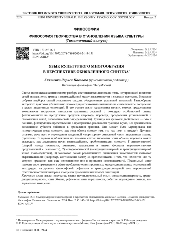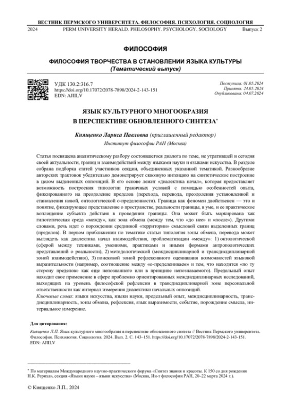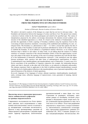 Статья посвящена аналитическому разбору состоявшегося диалога по теме, не утратившей и сегодня своей актуальности, границ и взаимодействий между языками науки и языками искусства. В разделе собрана подборка статей участников секции, объединенных указанной тематикой. Разнообразие авторских трактовок убедительно демонстрирует сквозную интенцию на синтетическое построение в целом выделенных оппозиций. В его основе лежит «диалектика начал», которая предоставляет возможность построения типологии граничных условий с помощью особенностей опыта, фиксированного на преодоление пределов (перехода, перевода, преодоления установленной и становления новой, онтологической о-пределенности). Граница как феномен двойственен - это и понятие, фиксирующее представление о пространстве, реальности границы, в уме, и ее практическое воплощение субъекта действия в проведении границы. Она может быть маркирована как гипотетическая среда «между», как зона обмена (между тем, что «до нее» и «после»). Другими словами, речь идет о порождении срединной «территории» смысловой связи выделенных границ (пределов). В первом приближении по тематике статьи типология зоны обмена, перевода может выглядеть как диалектика начал взаимодействия, проблематизации «между»: 1) онтологической (сферой между техниками, умениями, практиками и иными формами антропологических представлений о реальности), 2) методологической (междисциплинарной и трансдисциплинарной зоной взаимодействия), 3) поисковой зоной рефлексивного оценивания возможностей языковой выразительности (например, соотношение между «о-пределениваем» и тем, что находится «по ту сторону пределов» как еще непознанного или в принципе непознаваемого). Предельный опыт находит свое применение в сфере проблемно ориентированных междисциплинарных исследований, выходящих на уровень философской рефлексии в трансдисциплинарной зоне персональной ответственности как интервал измерения диалектики начальных оппозиций.