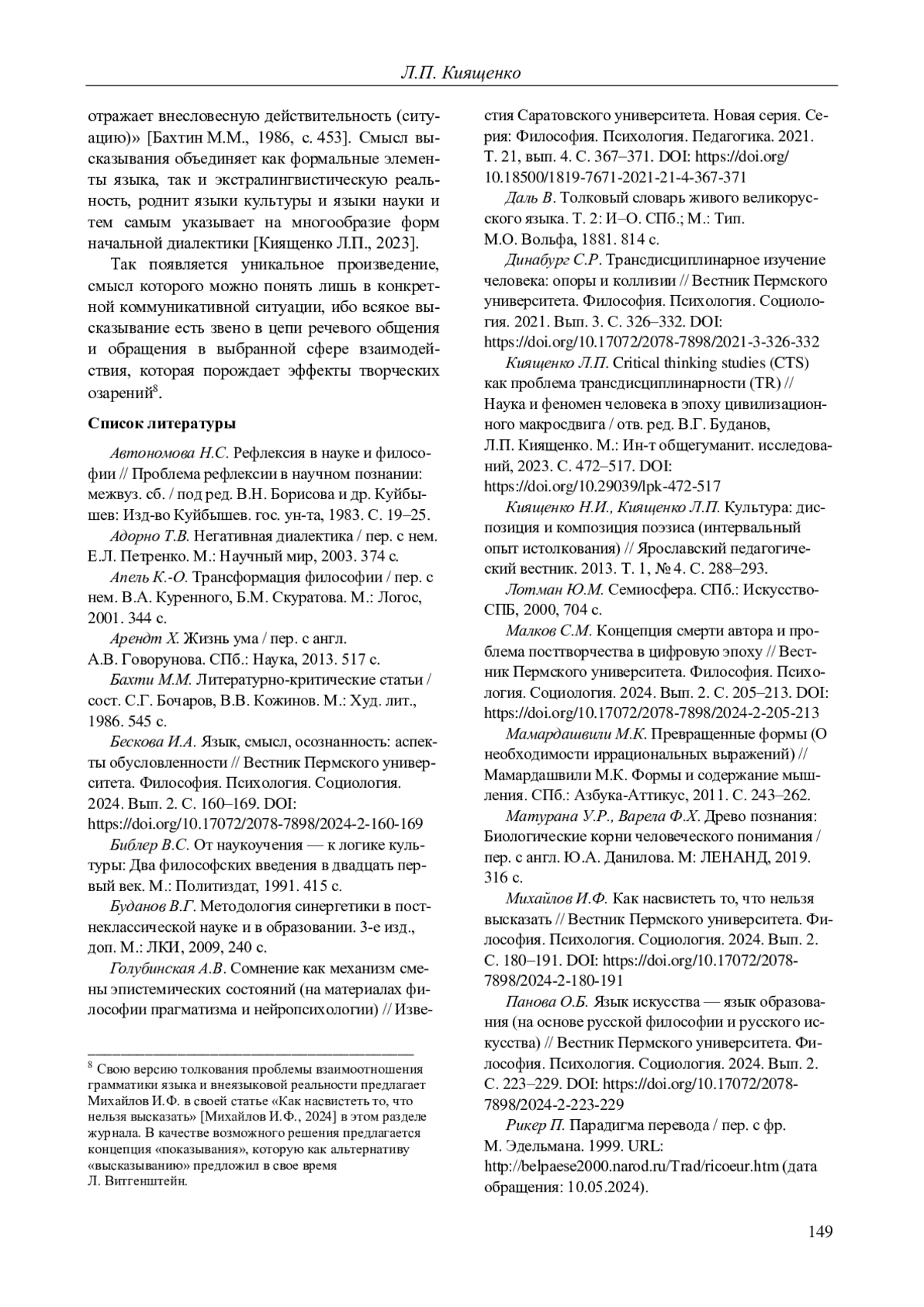 6. 	Бескова И.А. Язык, смысл, осознанность: аспекты обусловленности // Вестник Пермского университета. Философия. Психология. Социология. 2024. Вып. 2. С. 160-169. DOI: 10.17072/2078-7898/2024-2-160-169 EDN: BDUOGQ