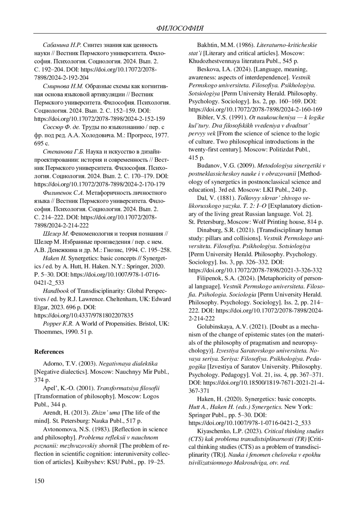 21. 	Сабанина Н.Р. Синтез знания как ценность науки // Вестник Пермского университета. Философия. Психология. Социология. 2024. Вып. 2. С. 192-204. DOI: 10.17072/2078-7898/2024-2-192-204 EDN: DGOLEA