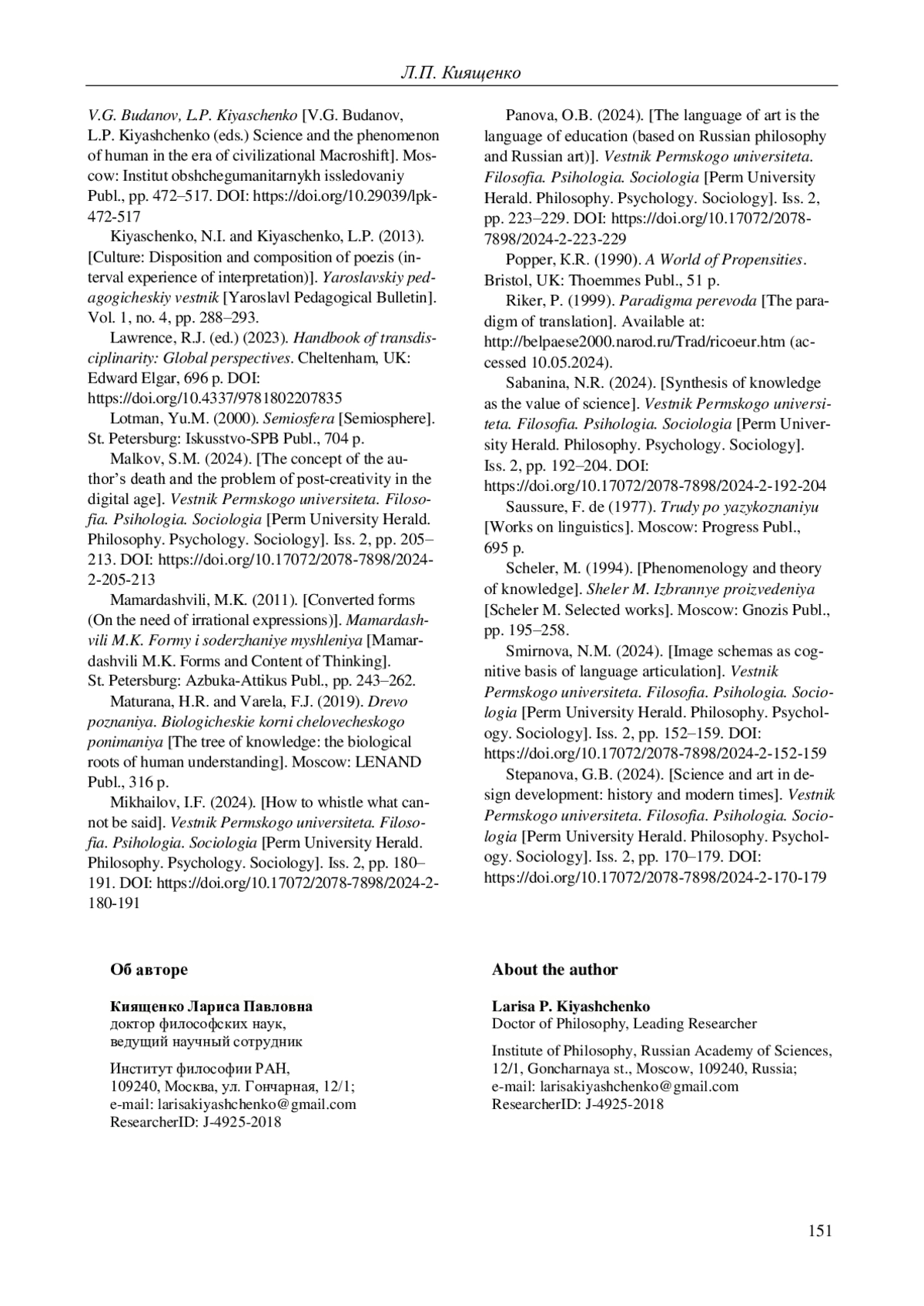 19. 	Панова О.Б. Язык искусства - язык образования (на основе русской философии и русского искусства) // Вестник Пермского университета. Философия. Психология. Социология. 2024. Вып. 2. С. 223-229. DOI: 10.17072/2078-7898/2024-2-223-229 EDN: KQTUXK