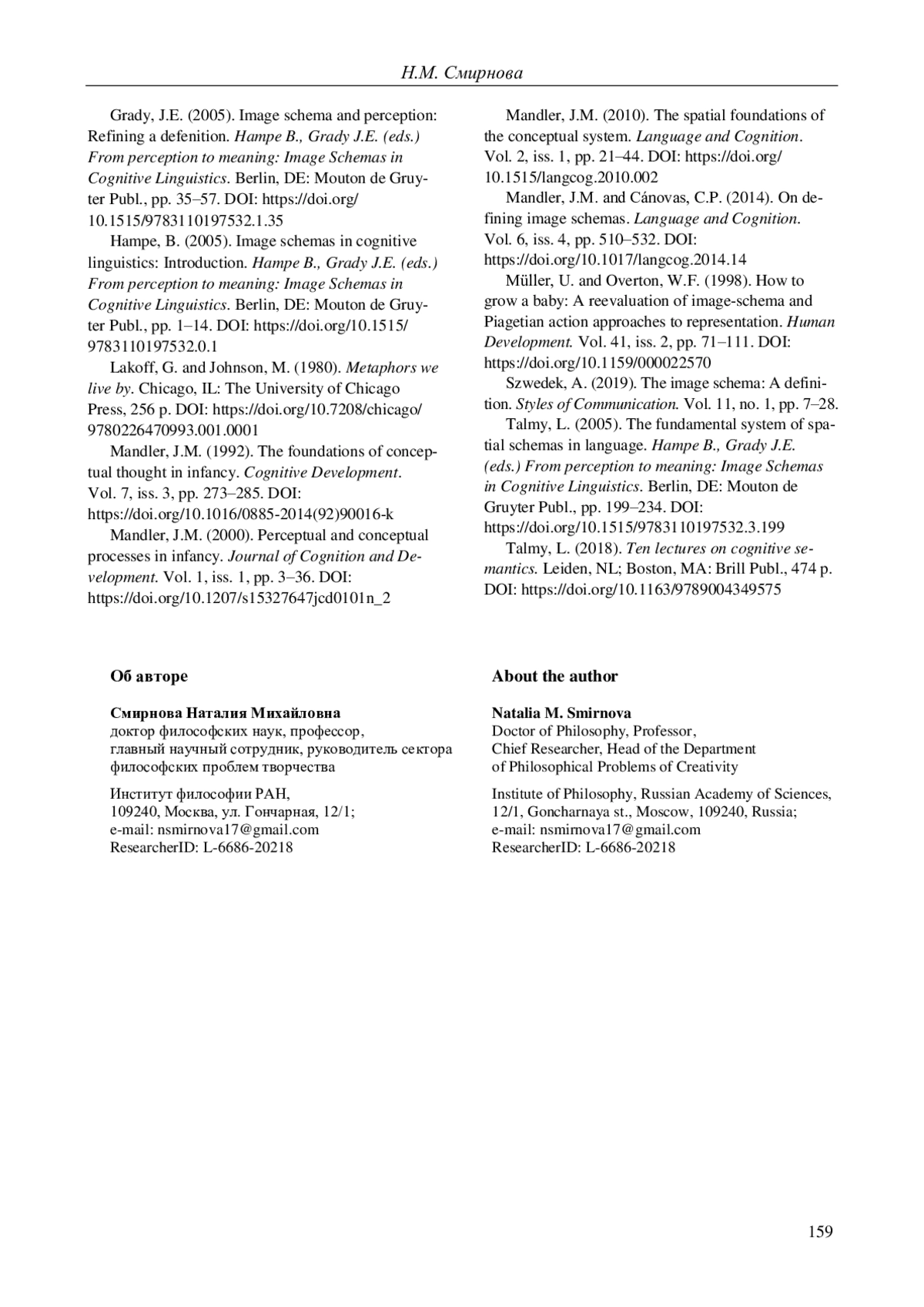 8. 	Mandler, J.M. and Cánovas, C.P. (2014). On defining image schemas. Language and Cognition. Vol. 6, iss. 4, pp. 510-532. DOI: 10.1017/langcog.2014.14