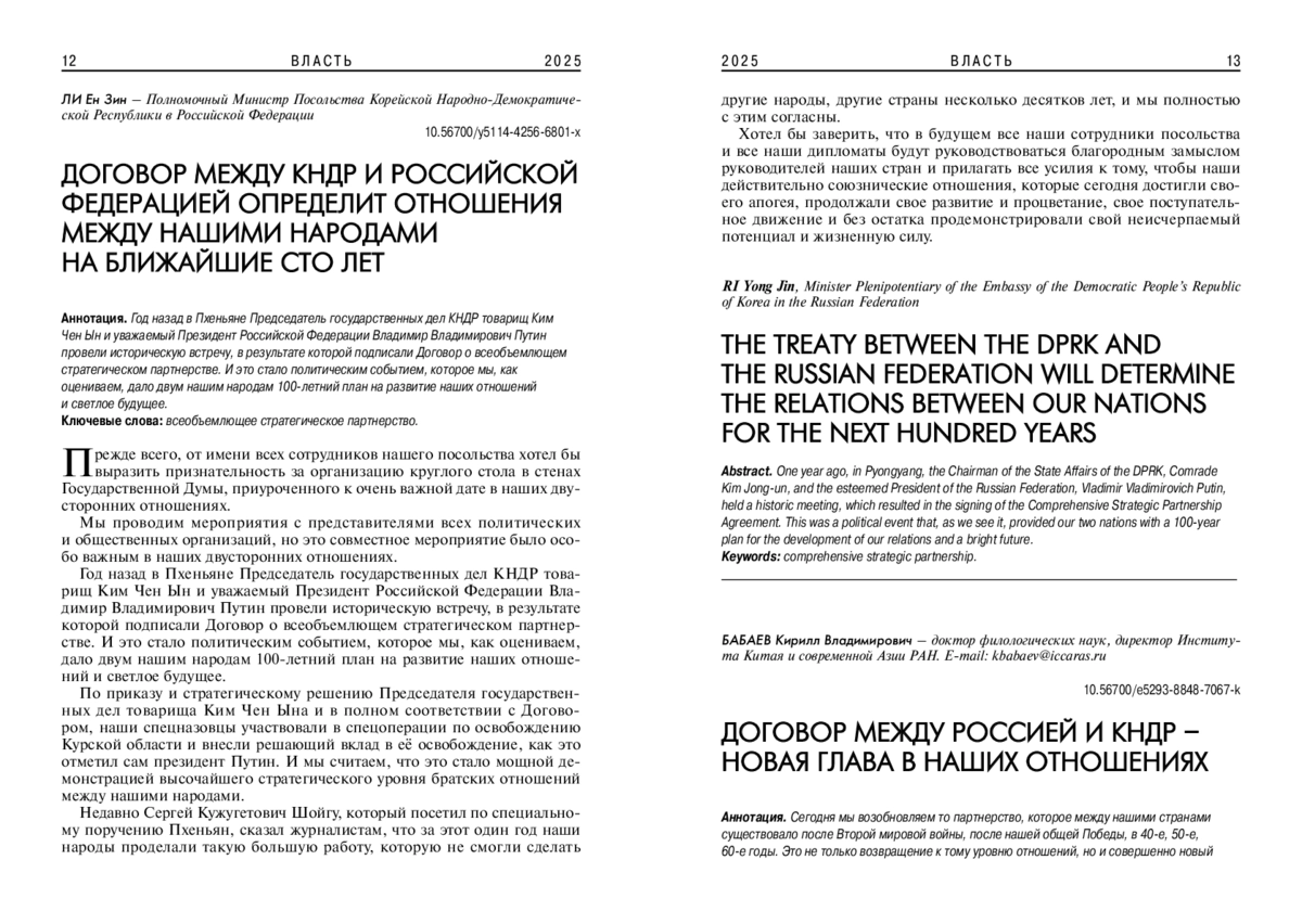 БАБАЕВ К. В. ДОГОВОР МЕЖДУ РОССИЕЙ И КНДР - НОВАЯ ГЛАВА В НАШИХ ОТНОШЕНИЯХ // ВЛАСТЬ. 2025. ТОМ 33 № S4
