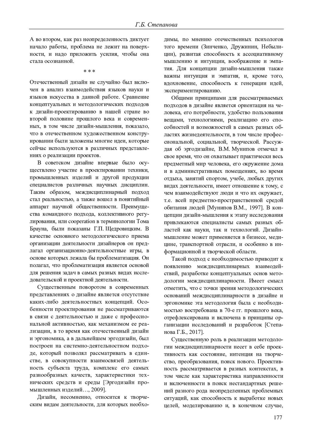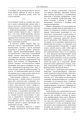 Дизайн является одной из значимых областей профессиональной деятельности человека, в которой в разных формах взаимодействуют языки науки и языки искусства. Проблемы такого взаимодействия ставились отечественными учеными и дизайнерами еще в 60-70-х гг. XX в. Это время характеризуется появлением целого ряда теоретических и методологических работ в области художественного проектирования, философии и психологии, посвященных новому пониманию дизайна как взаимодействия человека с его предметным миром. В самых разных трактовках отмечались общие позиции - это междисциплинарность и проектность дизайна. При разработках теории и методологии дизайна подчеркивалось особое место проектирования в художественно-конструкторской деятельности. Проектирование требует как знаний о вещах, их свойствах, способах действий с ними человека, месте и роли в его жизнедеятельности, так и о способах производства этих вещей. Концепция дизайн-мышления как современный подход к проектированию делает акцент на удовлетворении человеческих потребностей и потребительских запросов - это красота и удобство, облаченные в эстетичную форму. Общими принципами для рассматриваемых подходов в дизайне является ориентация на человека, его потребности, удобство пользования вещами, технологиями, реализацию его способностей и возможностей в самых разных областях жизнедеятельности, в том числе профессиональной, социальной, творческой. Дизайн-мышление может применяется в бизнесе, медицине, транспортной отрасли, и особенно в информационной и творческой области. Как в прошлом, так и в современности такой подход с необходимостью приводит к появлению междисциплинарных взаимодействий, разработке концептуальных основ методологии междисциплинарности. Имеет смысл отметить, что с точки зрения методологических оснований междисциплинарности в отечественном дизайне и эргономике эта методология была с необходимостью востребована, отрефлексирована и включена в принципы организации исследований и разработок. Существенную роль в реализации методологии междисциплинарности несет в себе проективность как состояние, интенция на творчество, преобразования, поиск нового.