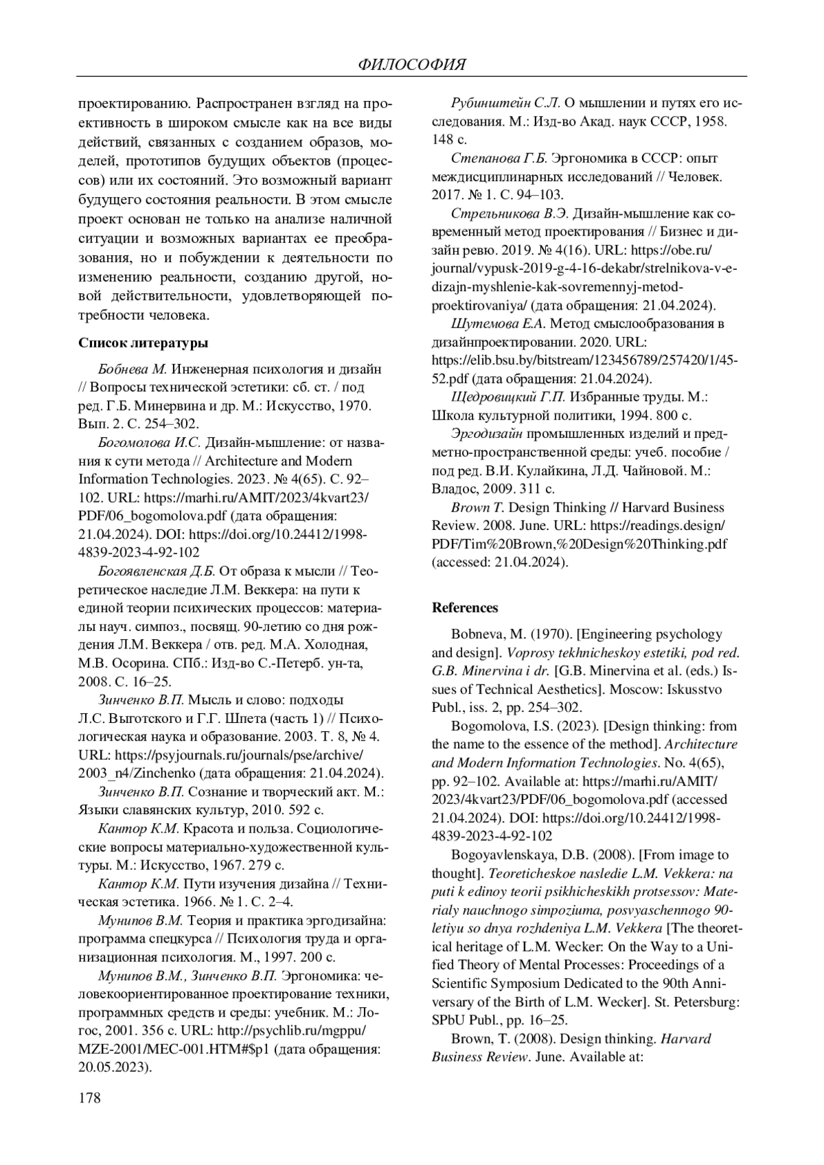 1. Бобнева М. Инженерная психология и дизайн // Вопросы технической эстетики: сб. ст. / под ред. Г.Б. Минервина и др. М.: Искусство, 1970. Вып. 2. С. 254-302.