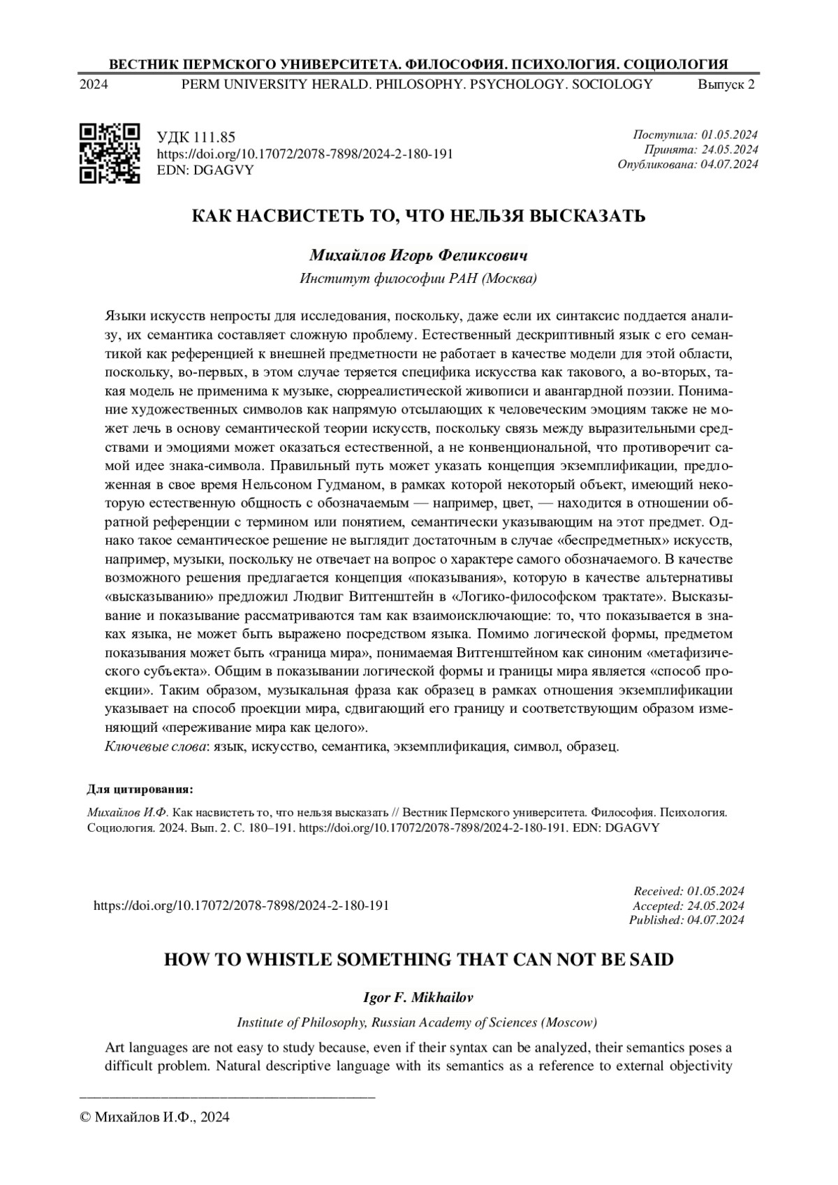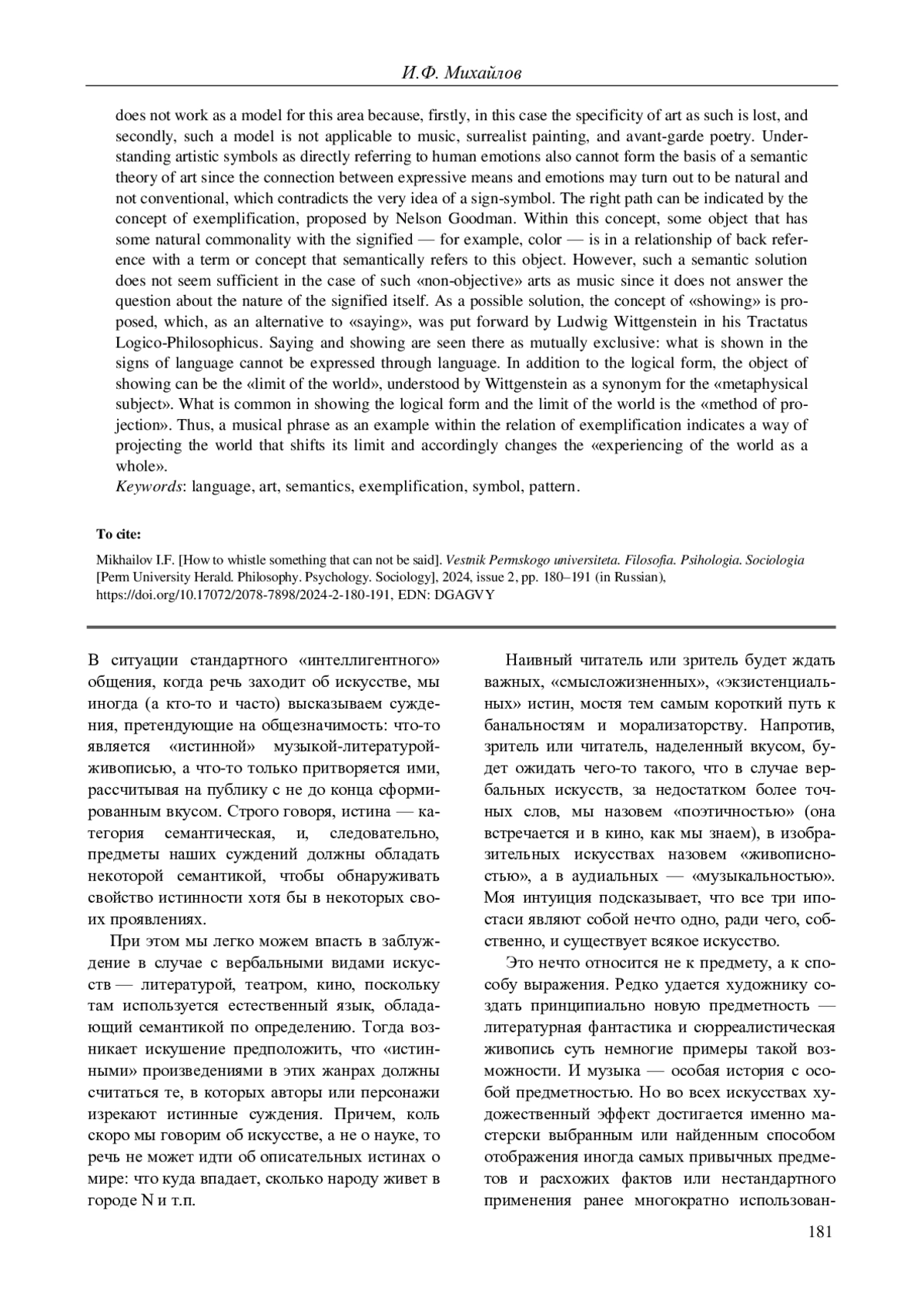 МИХАЙЛОВ И. Ф. КАК НАСВИСТЕТЬ ТО, ЧТО НЕЛЬЗЯ ВЫСКАЗАТЬ // ВЕСТНИК ПЕРМСКОГО УНИВЕРСИТЕТА. ФИЛОСОФИЯ. ПСИХОЛОГИЯ. СОЦИОЛОГИЯ. 2024. № 2