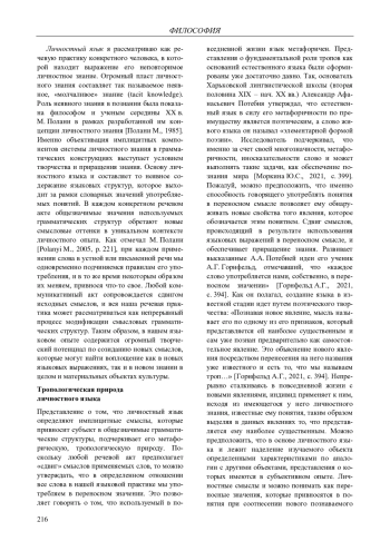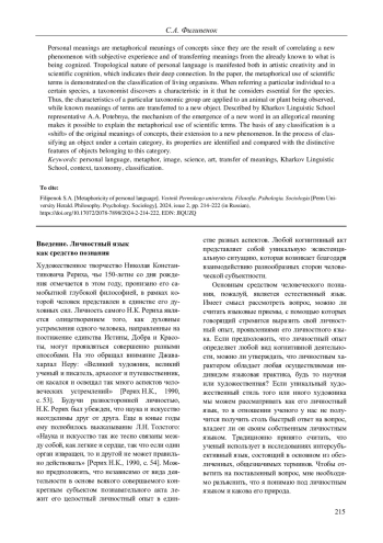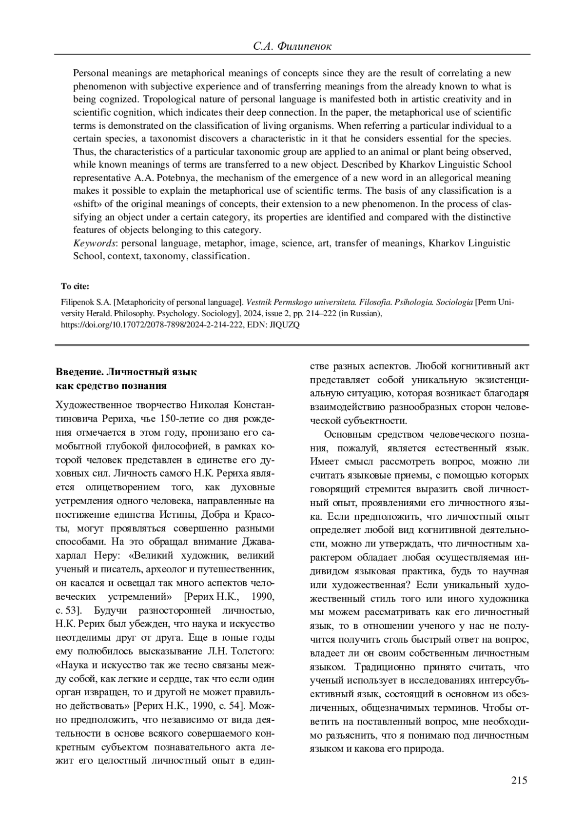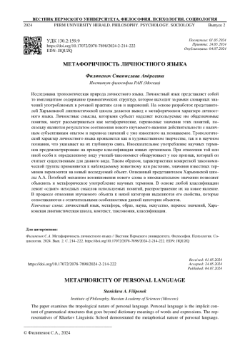 Исследована тропологическая природа личностного языка. Личностный язык представляет собой то имплицитное содержание грамматических структур, которое выходит за рамки словарных значений употребляемых в речевой практике слов и выражений. На основе разработок представителей Харьковской лингвистической школы делается вывод о метафорическом характере личностного языка. Личностные смыслы, которыми субъект наделяет используемые им общезначимые понятия, могут рассматриваться как метафорические, переносные значения этих понятий, поскольку являются результатом соотнесения нового изучаемого явления действительности с наличным субъективным опытом и переноса значений с уже известного на познаваемое. Тропологический характер личностного языка проявляется как в художественном творчестве, так и в научном познании, что указывает на их глубинную связь. Иносказательное употребление научных терминов продемонстрировано на примере классификации живых организмов. При отнесении той или иной особи к определенному виду ученый-таксономист обнаруживает у нее признак, который он считает существенным для данного вида. Таким образом, характеристики конкретной таксономической группы применяются к наблюдаемому животному или растению, значения известных терминов переносятся на новый исследуемый объект. Описанный представителем Харьковской школы А. А. Потебней механизм возникновения нового слова в иносказательном значении позволяет объяснить и метафорическое употребление научных терминов. В основе любой классификации лежит «сдвиг» исходных смыслов используемых понятий, распространение их на новое явление. В процессе отнесения изучаемого объекта к некой категории выделяются его свойства, которые сопоставляются с отличительными особенностями данной категории объектов.