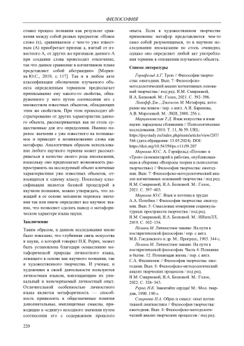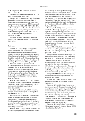 9. 	Смирнова Н.А. Образ и смысл: опыт когнитивной лингвистики // Философия творчества: ежегодник. Вып. 8: Философско-методологический анализ творческих процессов / под ред. Н.М. Смирновой, И.А. Бесковой. М.: Голос, 2022. С. 150-178.