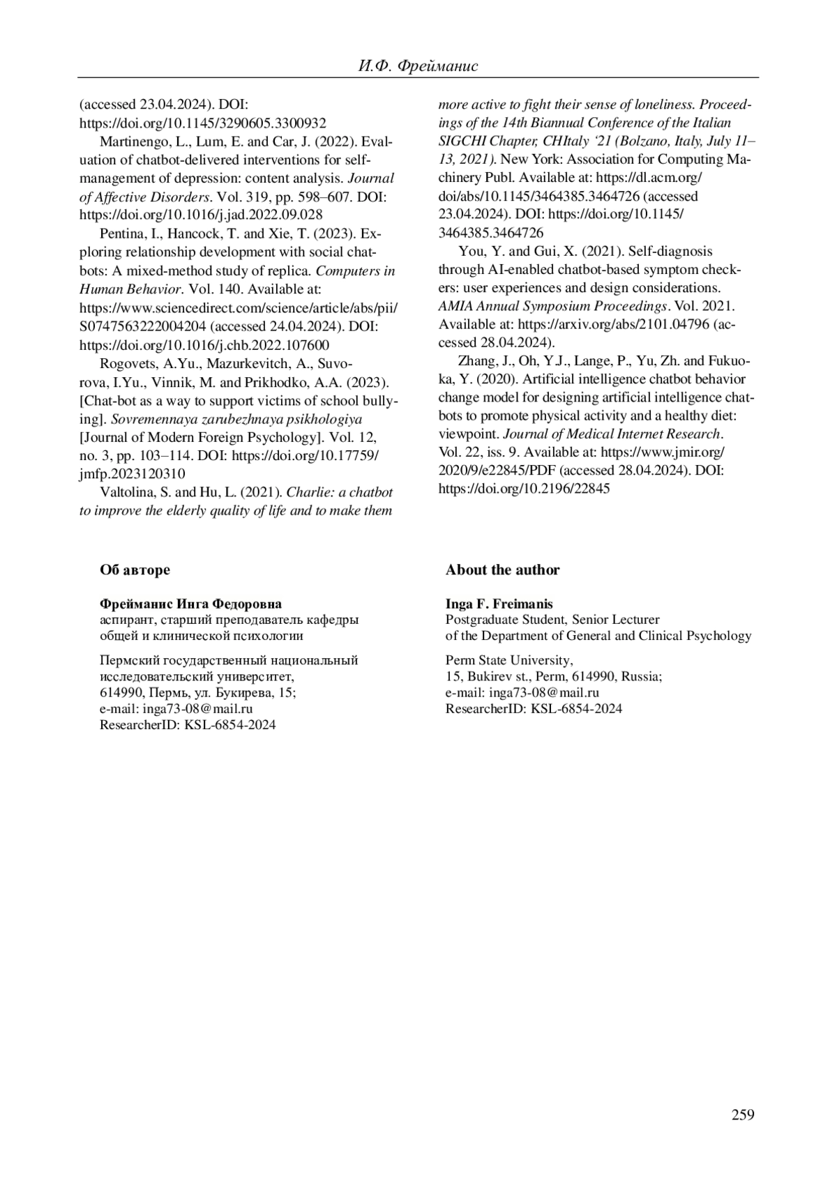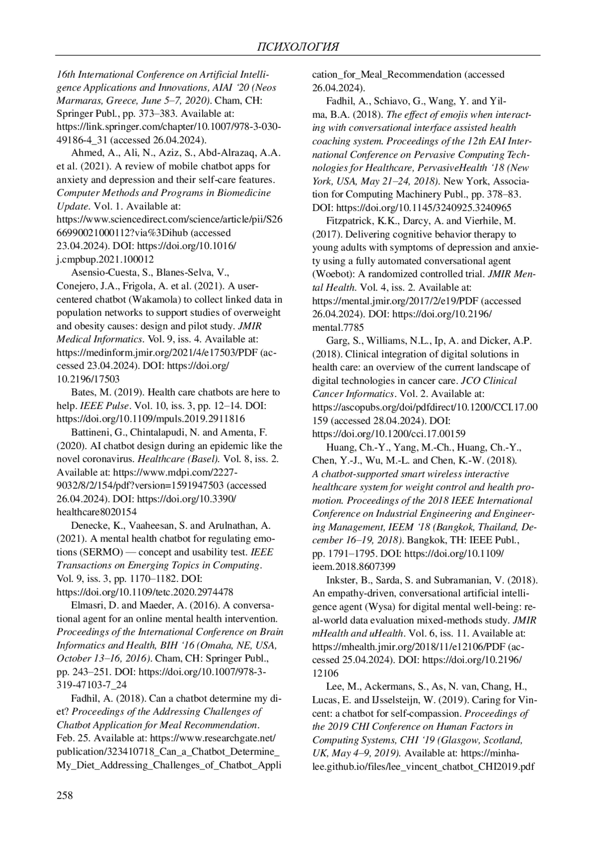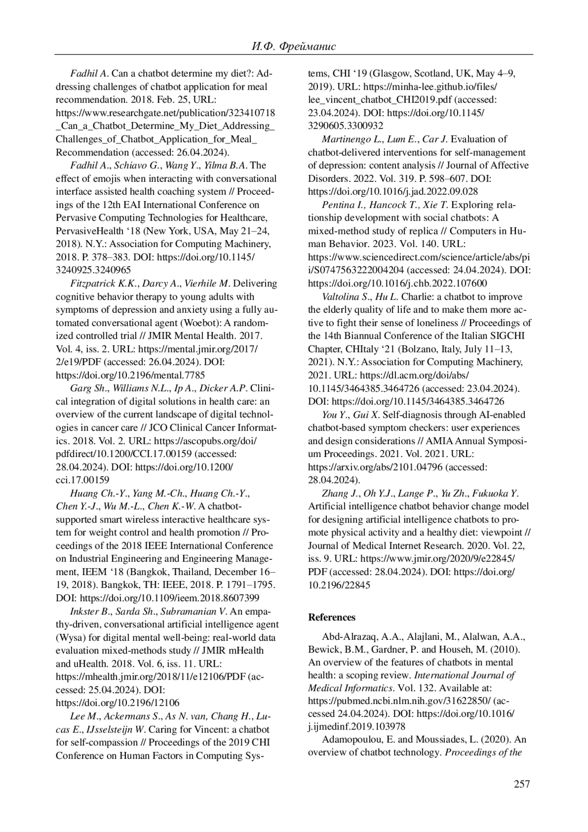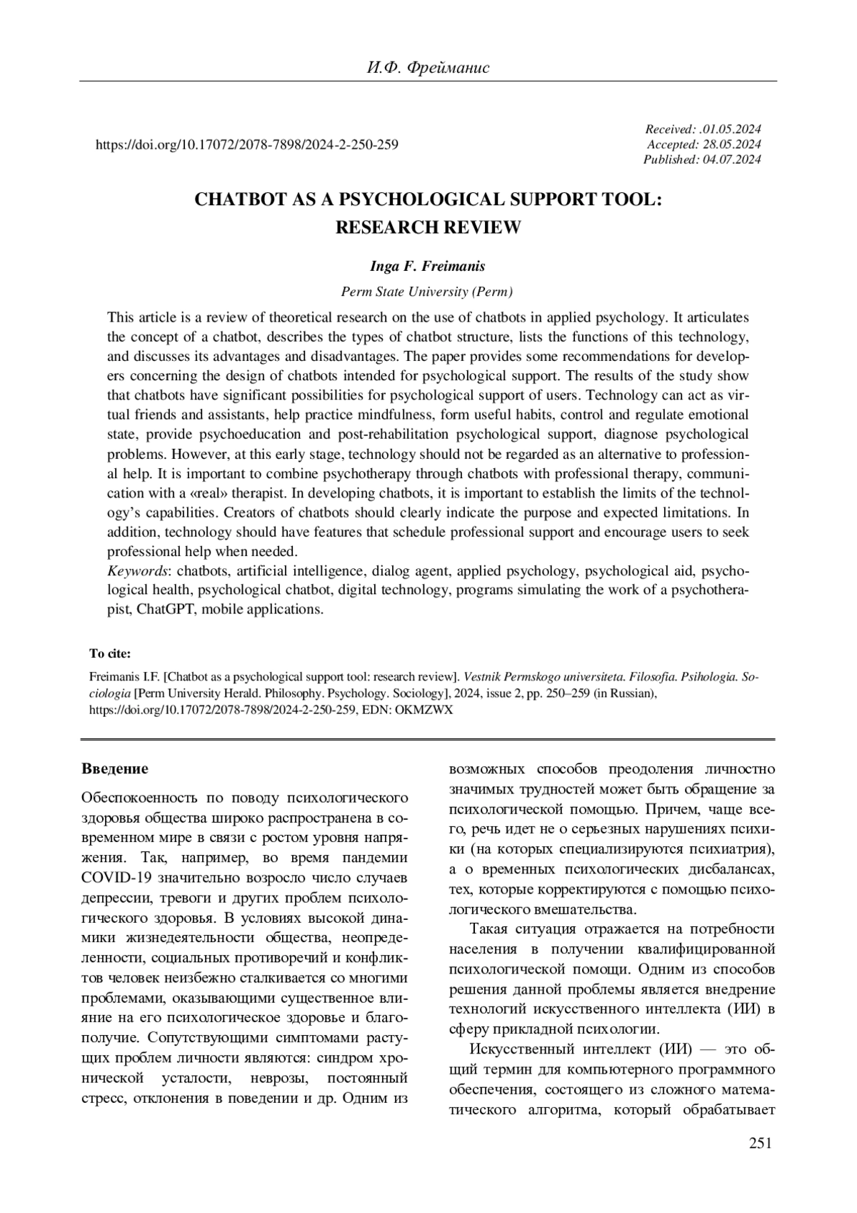 ФРЕЙМАНИС И. Ф. ЧАТ-БОТ, КАК ИНСТРУМЕНТ ПСИХОЛОГИЧЕСКОЙ ПОДДЕРЖКИ: ОБЗОР ИССЛЕДОВАНИЙ // ВЕСТНИК ПЕРМСКОГО УНИВЕРСИТЕТА. ФИЛОСОФИЯ. ПСИХОЛОГИЯ. СОЦИОЛОГИЯ. 2024. № 2