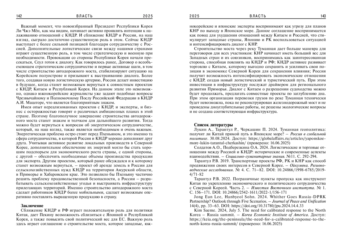 4. 	Тарантул Р.В. 2022. Пограничные пункты пропуска как инструмент Китая по укреплению экономического и политического сотрудничества с Северной Кореей. Часть 2. - Известия Восточного института. № 1. С. 156-171. DOI: 10.24866/2542-1611/2022-1/156-171 EDN: WBLLNJ