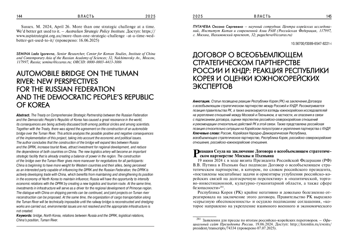 Договор о всеобъемлющем стратегическом партнерстве между Россией и КНДР вызвал большой резонанс в мире, его последствия активно обсуждаются как среди политических кругов, так и среди ученых. Вместе с ним было подписано соглашение о строительстве автомобильного моста через реку Туманная. Данная статья анализирует возможные позитивные и негативные последствия от реализации данного проекта, учитывая экономическую и политическую составляющие. Автор приходит к выводу, что строительство автомобильного моста позволит расширить связи между Россией и КНДР, увеличить туристические потоки, привлечь инвестиции для регионального развития, а также снизить зависимость обеих стран от Китая. Новая логистическая артерия станет важным стратегическим объектом, который уже создает баланс сил в регионе.