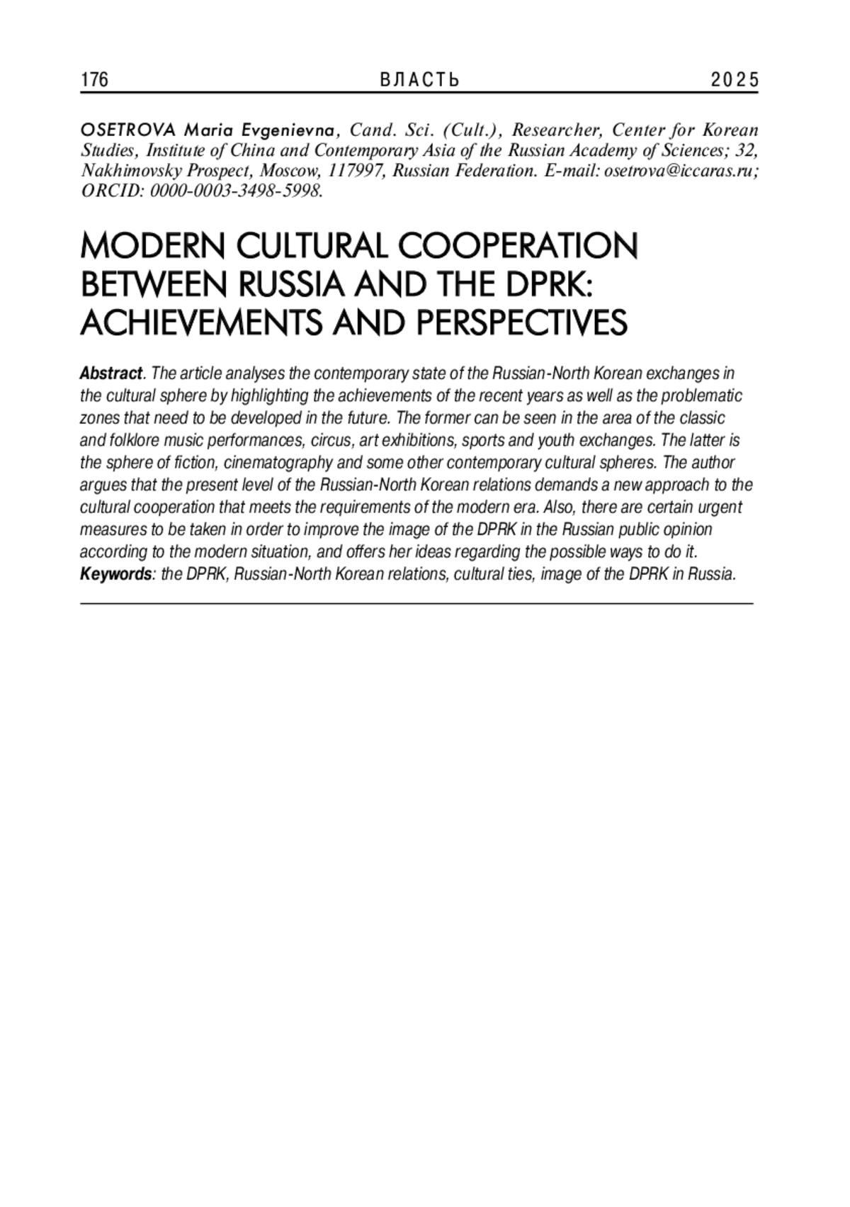 В статье анализируется современное состояние российско-северокорейских обменов в области культуры, отмечаются успехи, достигнутые в последнее время, а также зоны роста, работать с которыми только предстоит. В частности, конкретные результаты уже можно наблюдать по линии музыкальных творческих коллективов, циркового искусства, художественных выставок, спорта, юношеских и молодёжных обменов. Однако сферы художественной литературы, кинематографа и некоторых других ещё ждут своего полноценного развития. В статье также предложены идеи по перезагрузке образа КНДР в российском общественном мнении в соответствии с современными реалиями.