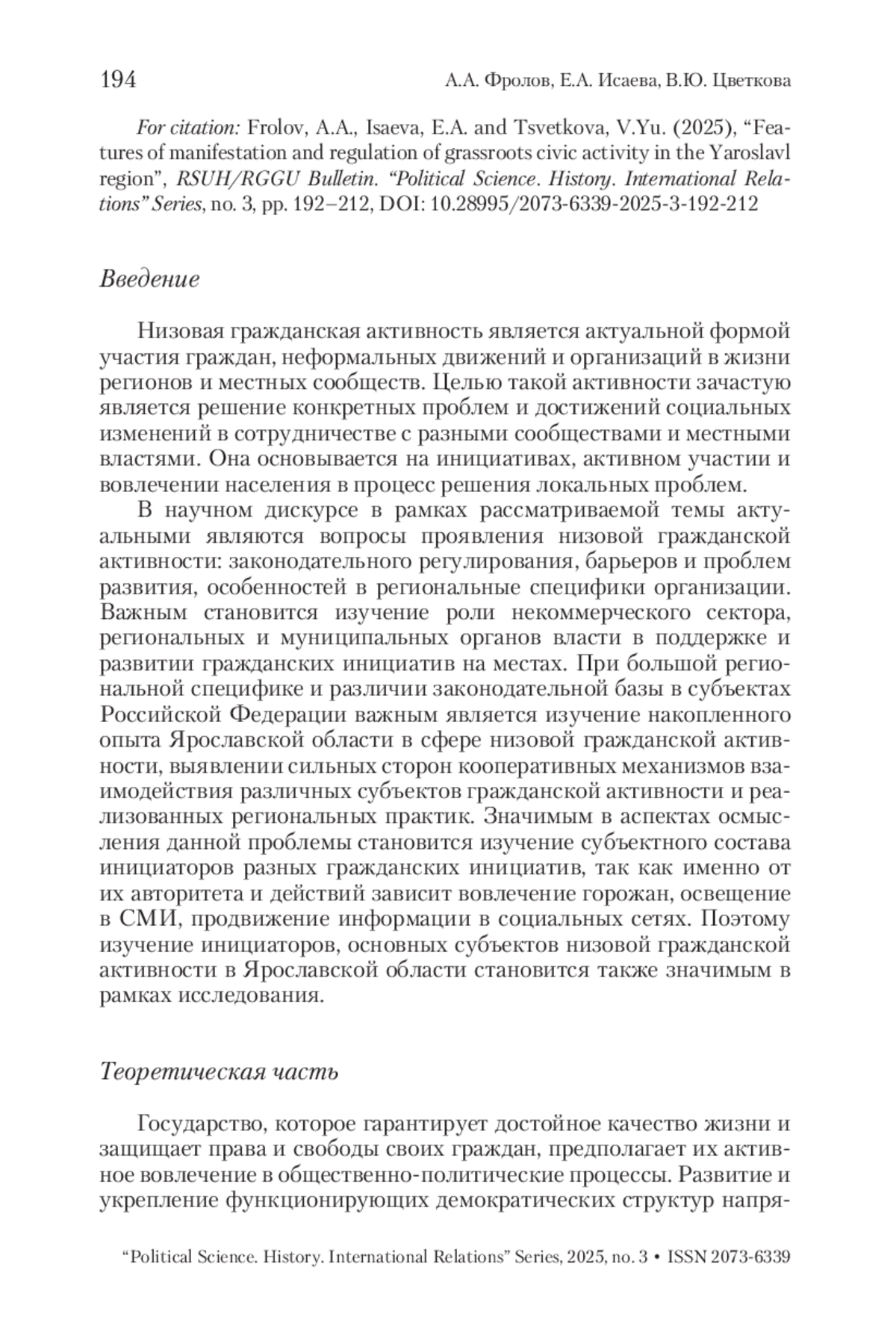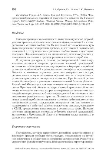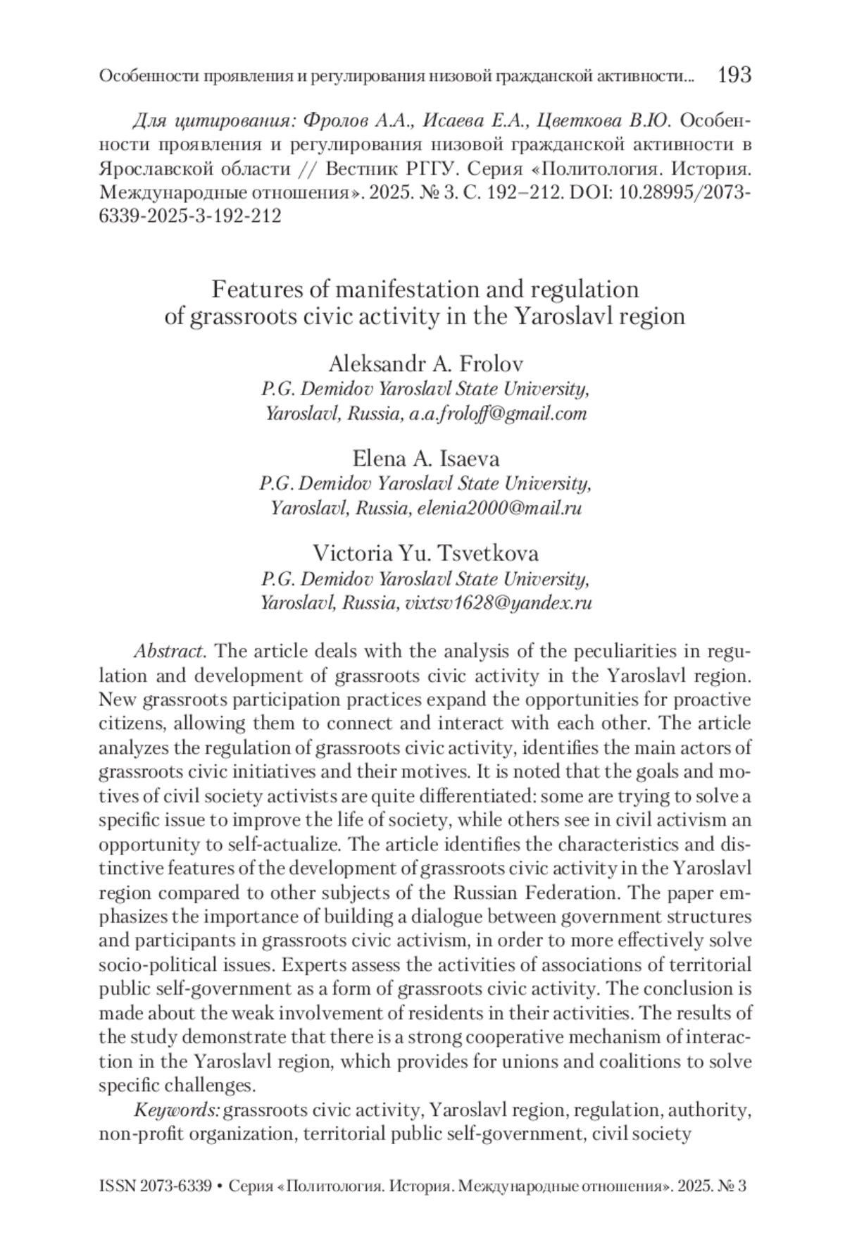 Статья посвящена анализу особенностей регулирования и развития низовой гражданской активности в Ярославской области. Новые практики низового участия расширяют возможности инициативных граждан, позволяя им объединяться и взаимодействовать друг с другом. В статье анализируется регулирование низовой гражданской активности, определяются основные акторы низовых гражданских инициатив и их мотивы. Отмечается, что цели и мотивы у гражданских активистов довольно дифференцированы: некоторые пытаются решить конкретную проблему для улучшения жизни общества, а другие видят в гражданском активизме возможность самореализоваться. В статье выявляются особенности и отличительные черты развития низовой гражданской активности в Ярославской области по сравнению с другими субъекта Российской Федерации. В работе подчеркивается важность выстраивания диалога между властными структурами и участниками низового гражданского активизма для более эффективного решения общественно-политических проблем. Экспертами дается оценка деятельности объединений территориального общественного самоуправления как формы низовой гражданской активности. Делается вывод о слабой вовлеченности жителей в их деятельность. Результаты исследования демонстрируют, что в Ярославской области сильный кооперативный механизм взаимодействия, предусматривающий объединения в союзы и коалиции для решения конкретных проблем.