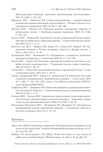 16. Трофимова 2015 - Трофимова И.Н. Поколенческий фактор гражданской активности в российском обществе // Социологическая наука и социальная практика. 2015. № 2 (10). С. 5-17.