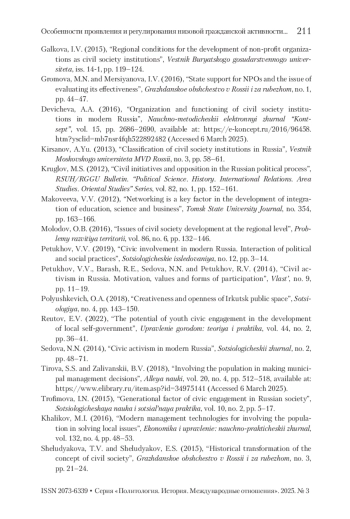 3. Галкова 2015 - Галкова И.В. Региональные условия развития некоммерческих организаций как институтов гражданского общества // Вестник Бурятского государственного университета. 2015. Вып. 14-1. С. 119-124.