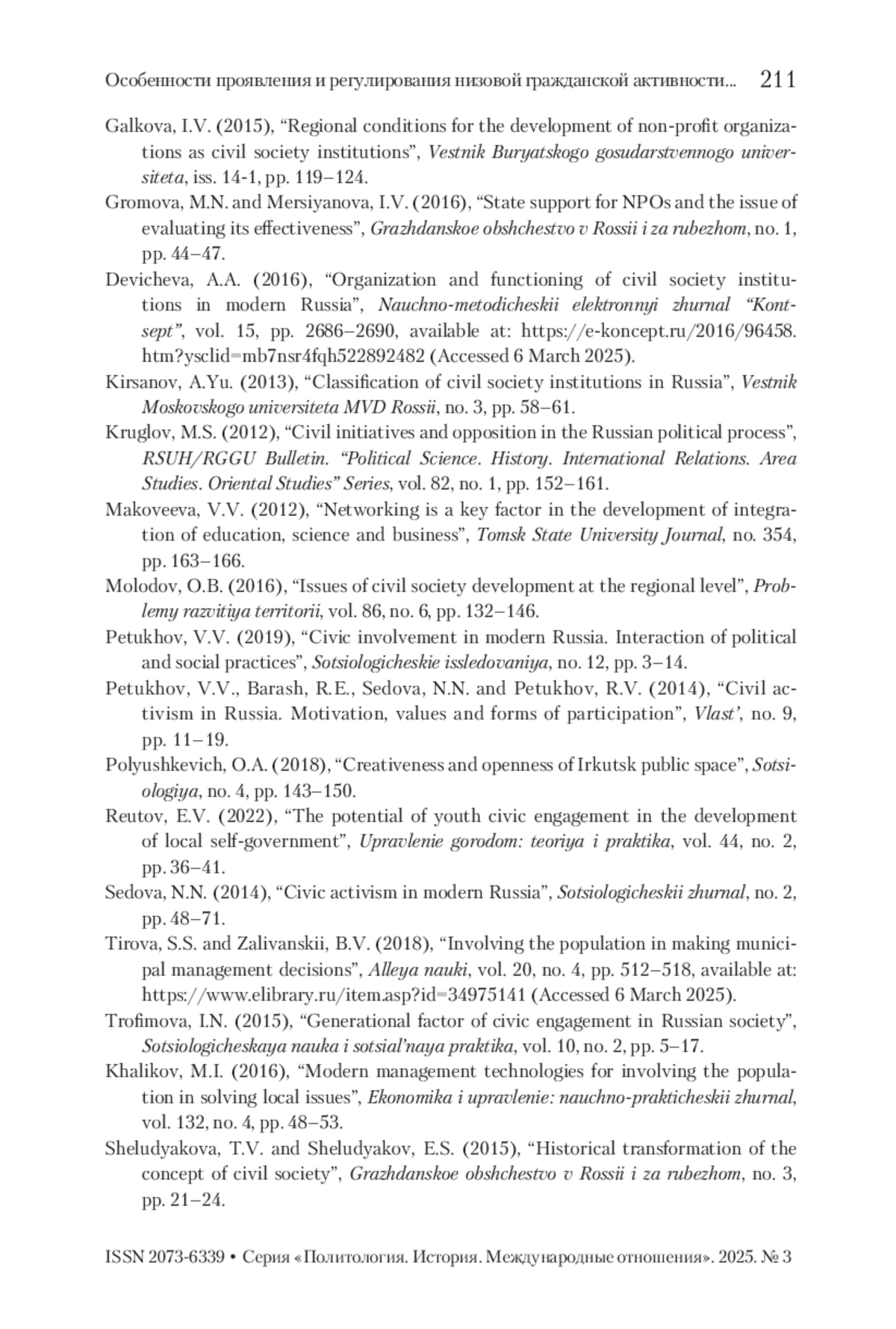 5. Девичева 2016 - Девичева А.А. Организация и функционирование институтов гражданского общества в современной России // Научно-методический электронный журнал «Концепт». 2016. Т. 15. С. 2686-2690. URL: https://e-koncept.ru/2016/96458.htm?ysclid=mb7nsr4fqh522892482 (дата обращения 06. 03. 2025).