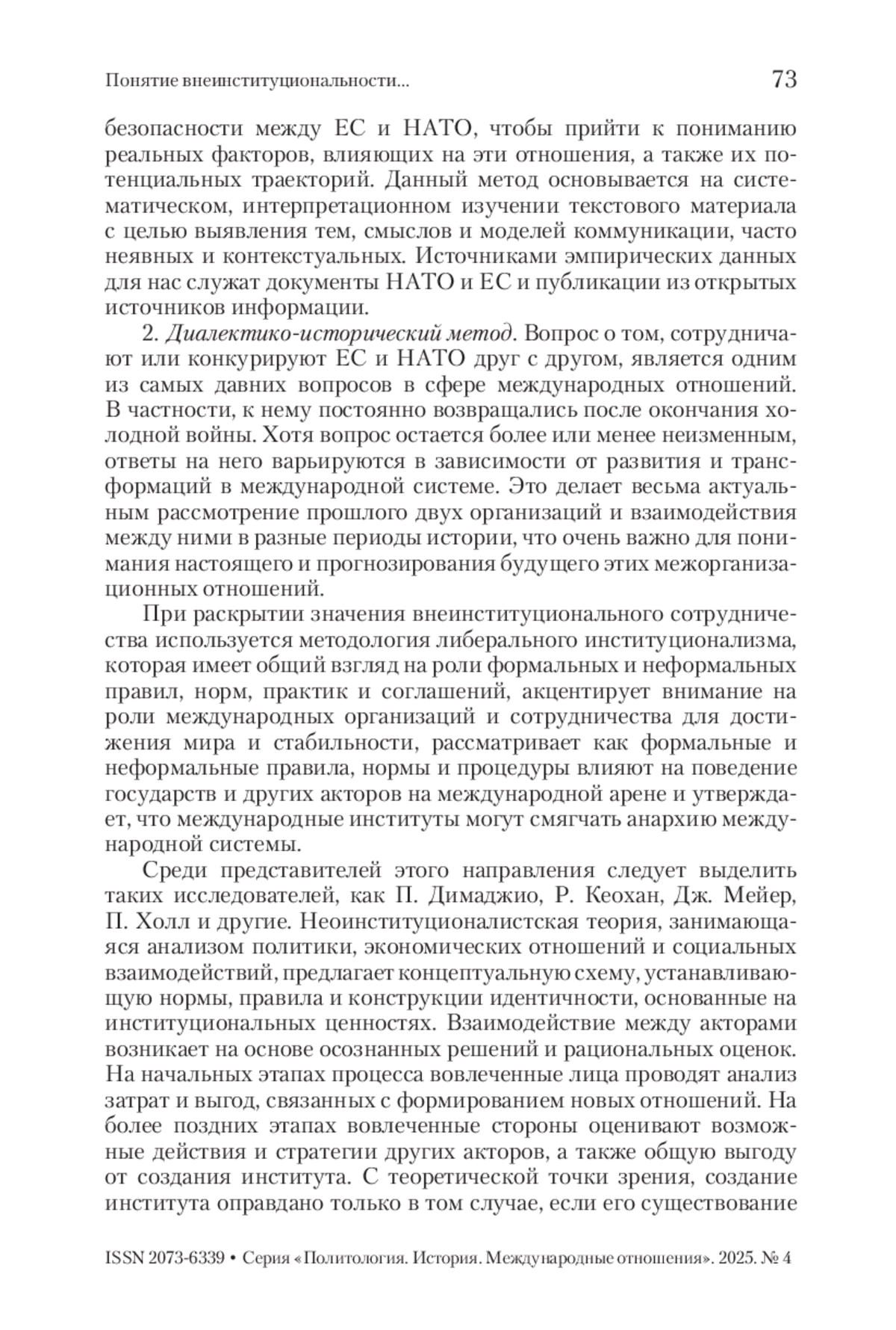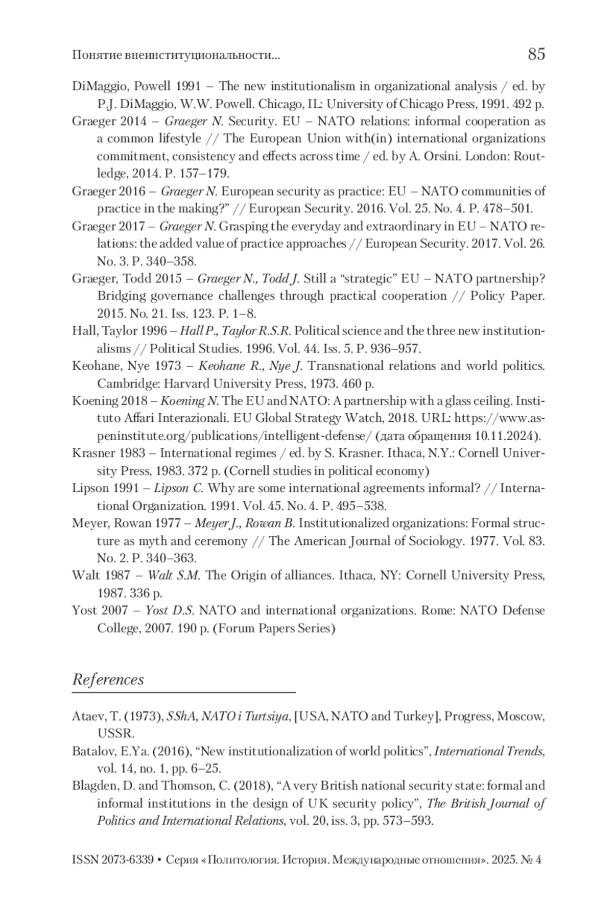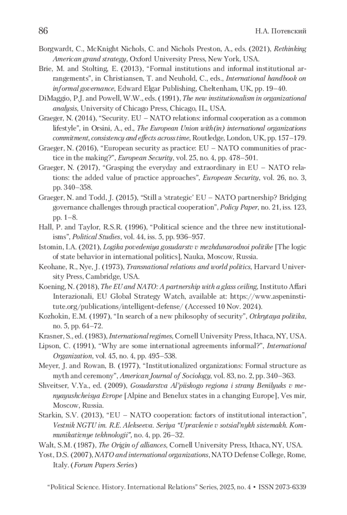 ПОТЕВСКИЙ Н. А. ПОНЯТИЕ ВНЕИНСТИТУЦИОНАЛЬНОСТИ В РАМКАХ СОТРУДНИЧЕСТВА ЕС И НАТО // ВЕСТНИК РГГУ. СЕРИЯ: ПОЛИТОЛОГИЯ. ИСТОРИЯ. МЕЖДУНАРОДНЫЕ ОТНОШЕНИЯ. 2025. № 4